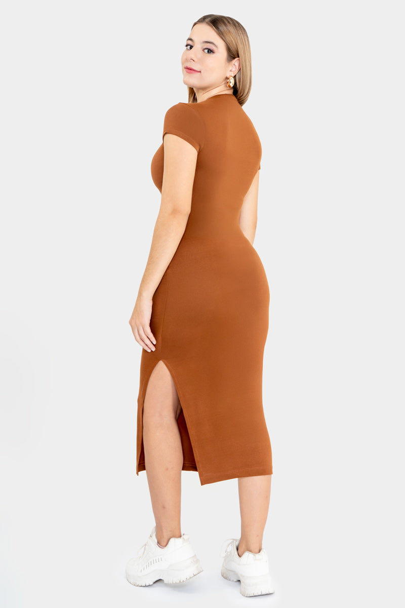 Vestido midi de manga corta con cuello alto con abertura en un costado.