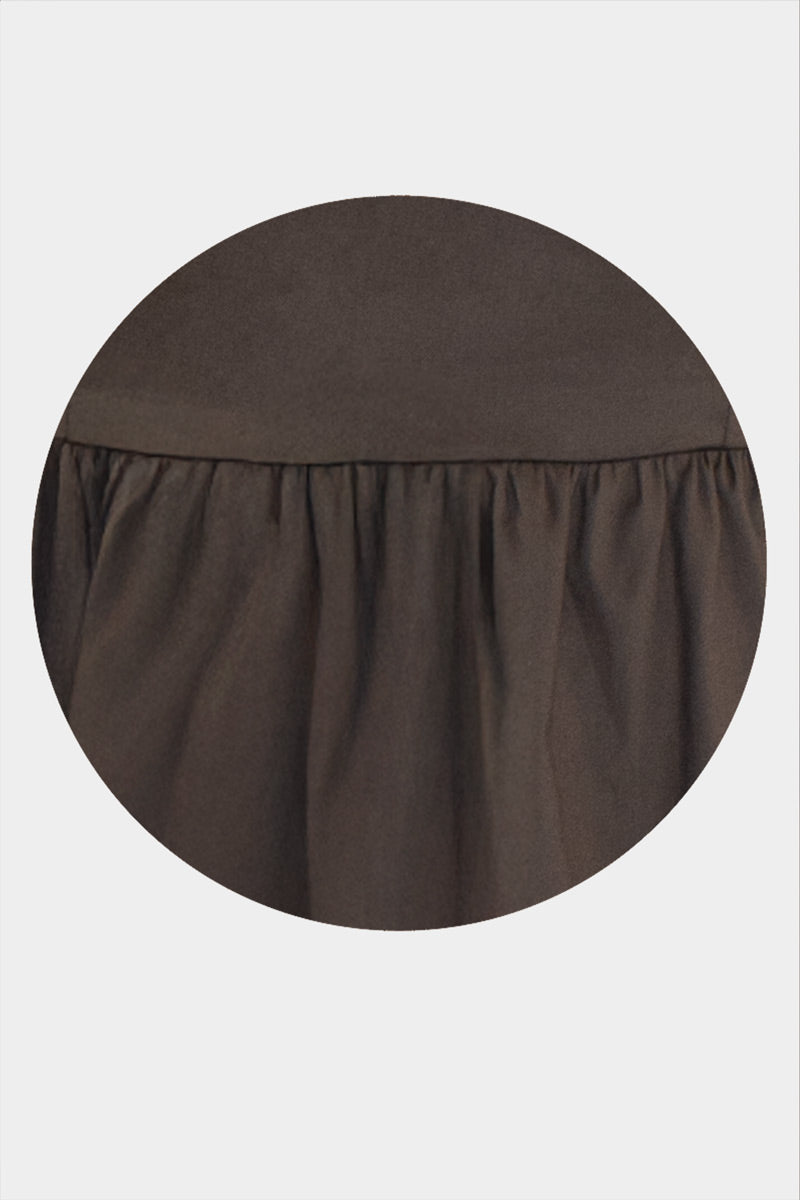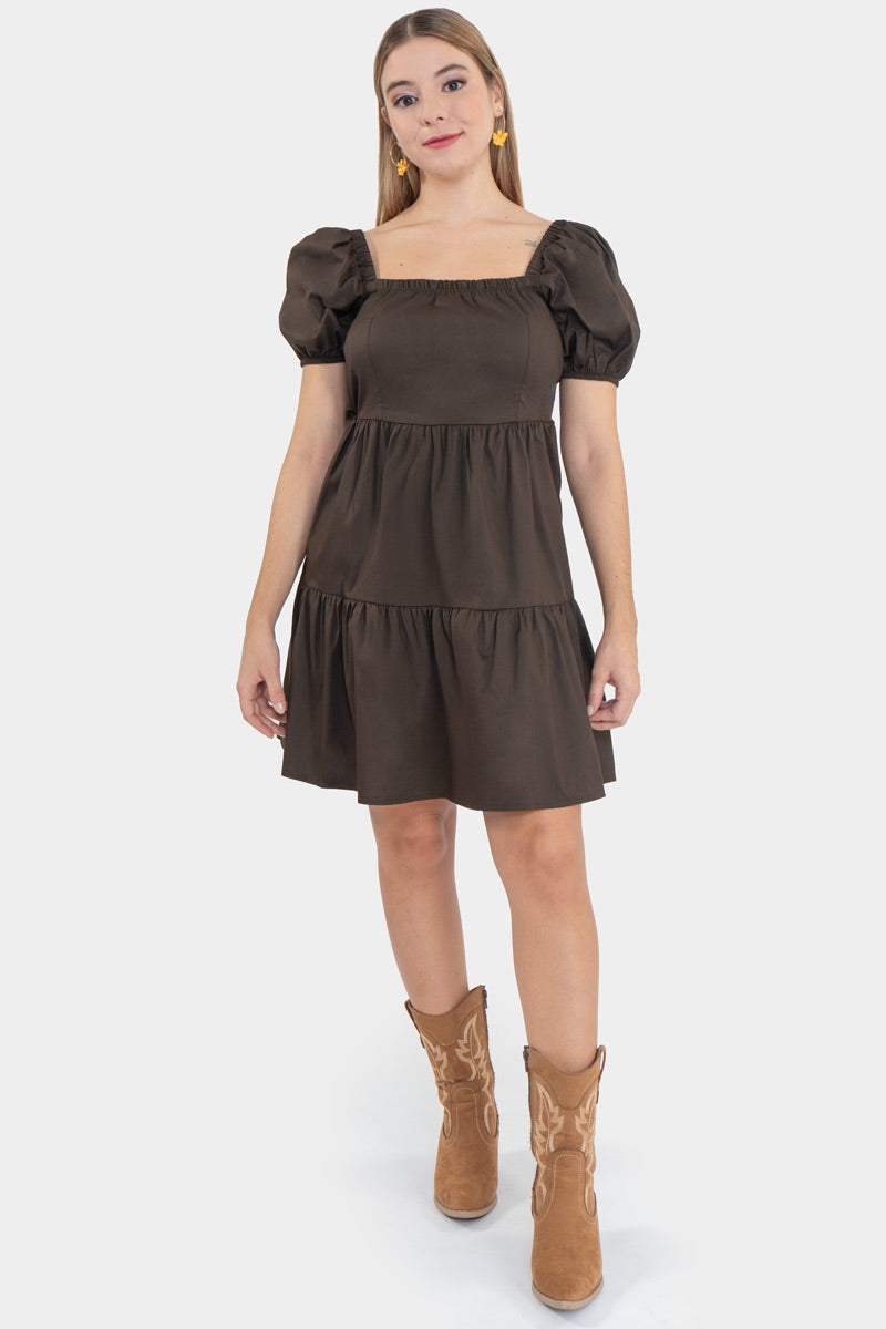 Descubre este vestido corto de estilo campestre en tono marrón oscuro, con volantes en tres niveles y manga corta globo. Diseño favorecedor y cómodo, perfecto para un look juvenil y chic; combínalo con botas tipo botin o sandalias para un toque moderno y versátil para el día a día.