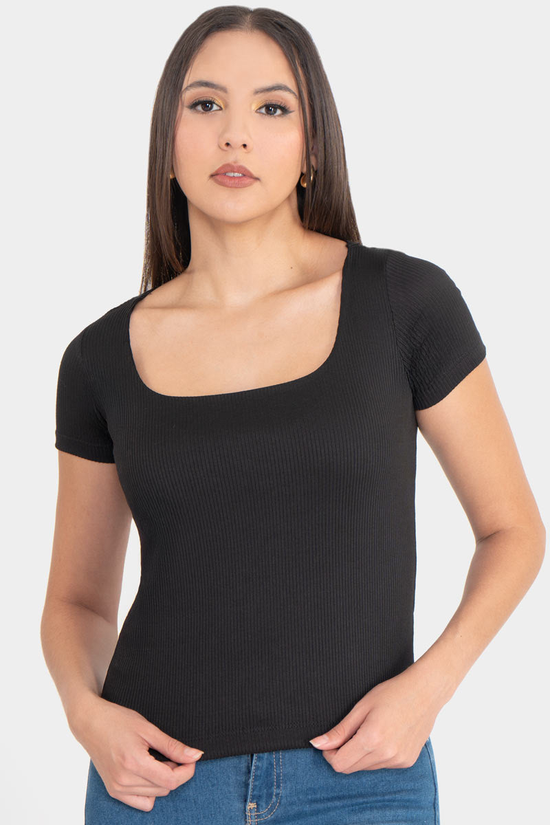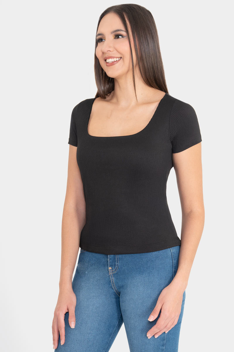 ¡El básico que no puede faltar en tu clóset! Este top negro de manga corta es la combinación perfecta de estilo y comodidad. Su diseño ajustado con tejido acanalado realza tu figura, mientras que el escote cuadrado le da un toque moderno y súper femenino. Ideal para combinar con jeans, faldas o pantalones de tiro alto. Ya sea para un look casual de día o una salida de noche, este top será tu mejor aliado.