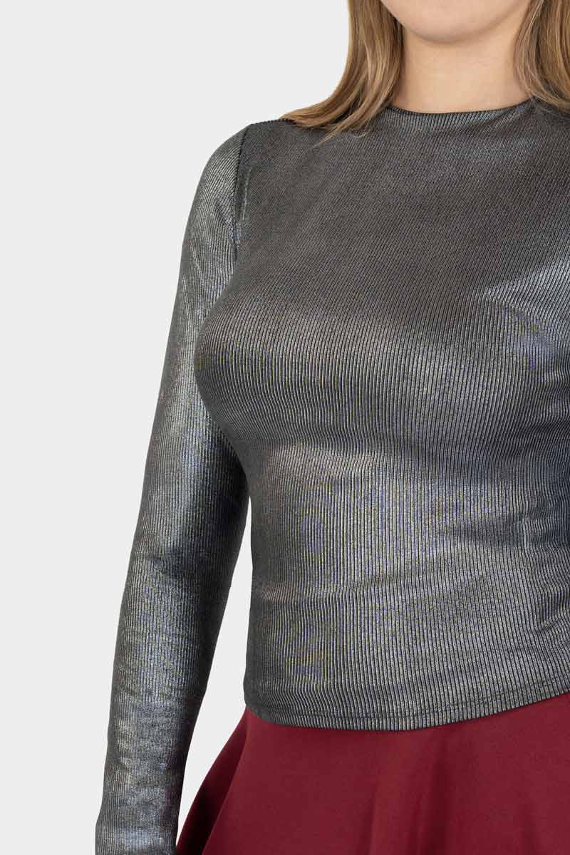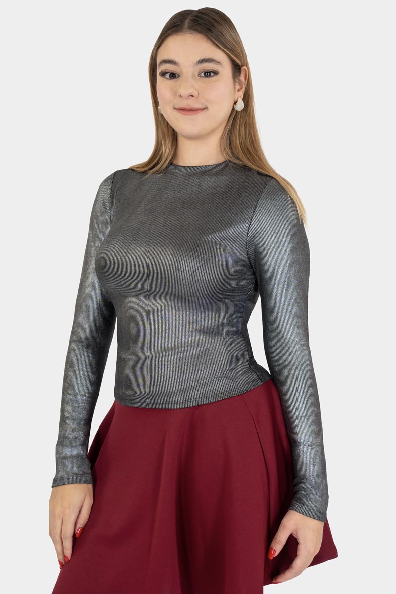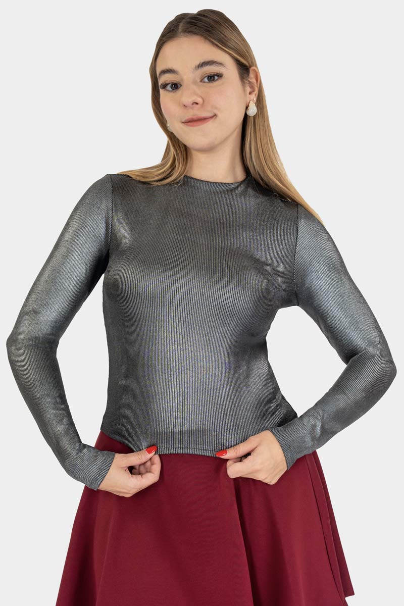 Esta blusa metálica de manga larga es la opción perfecta para darle un toque futurista y súper trendy a tu outfit. Su brillo sutil y tela acanalada crean un look moderno y juvenil que destaca sin esfuerzo. Ideal para noches casuales, fiestas o para elevar un outfit básico con un toque elegante y atrevido.