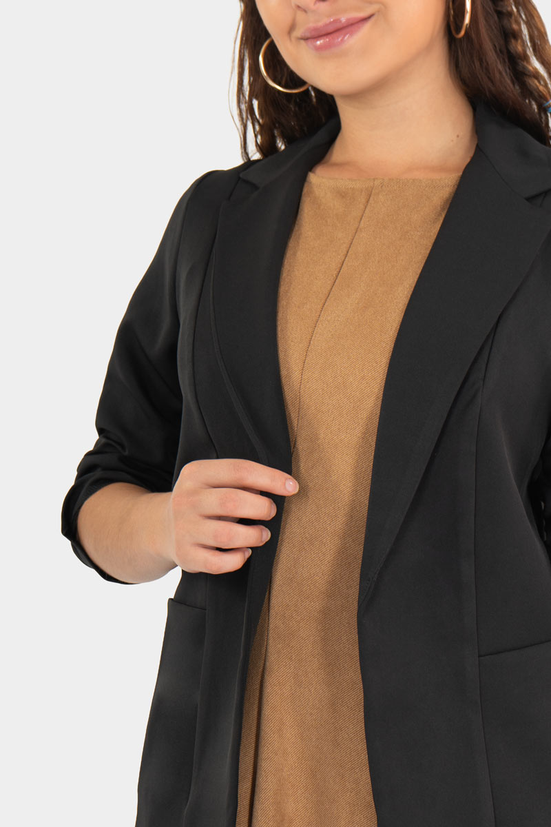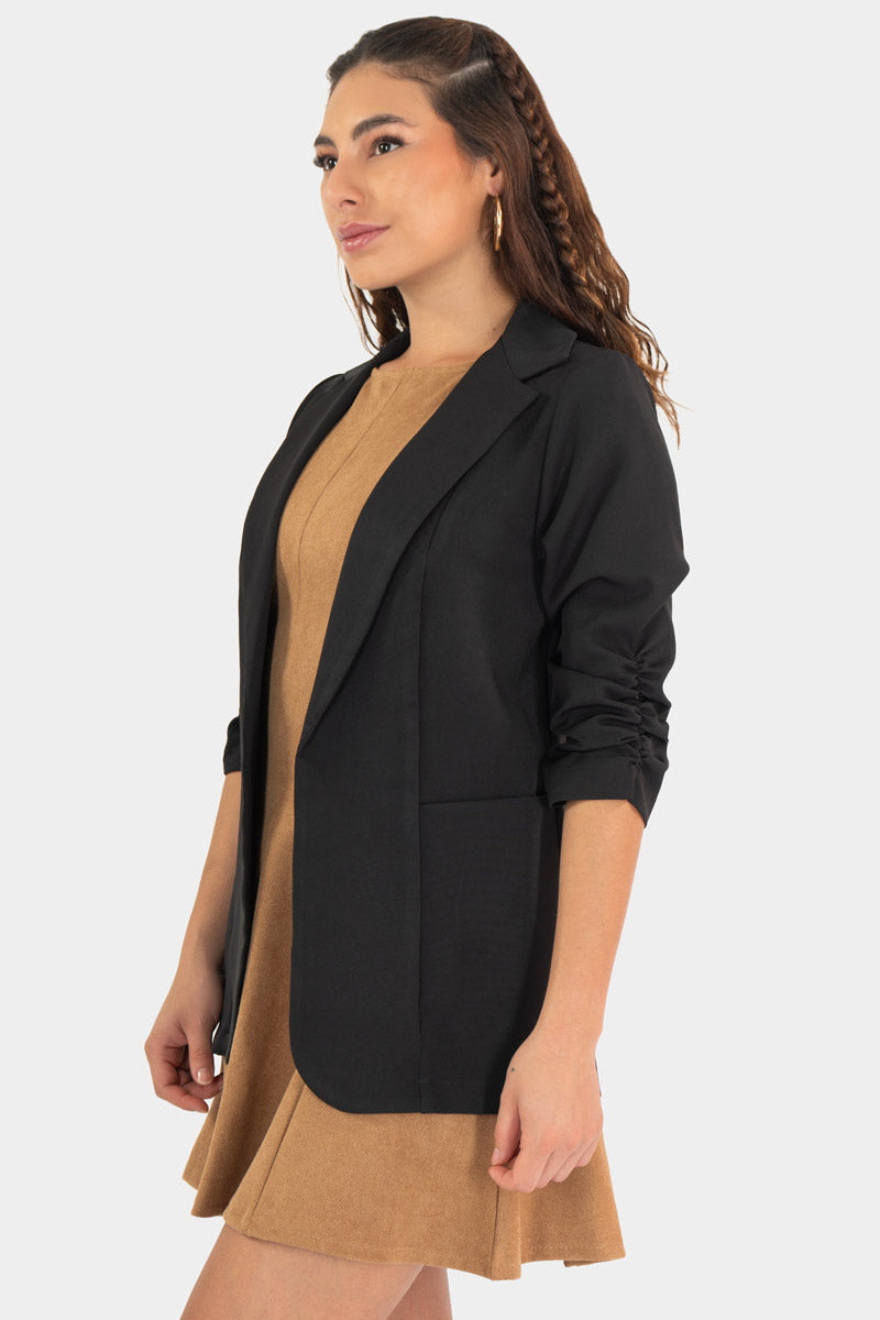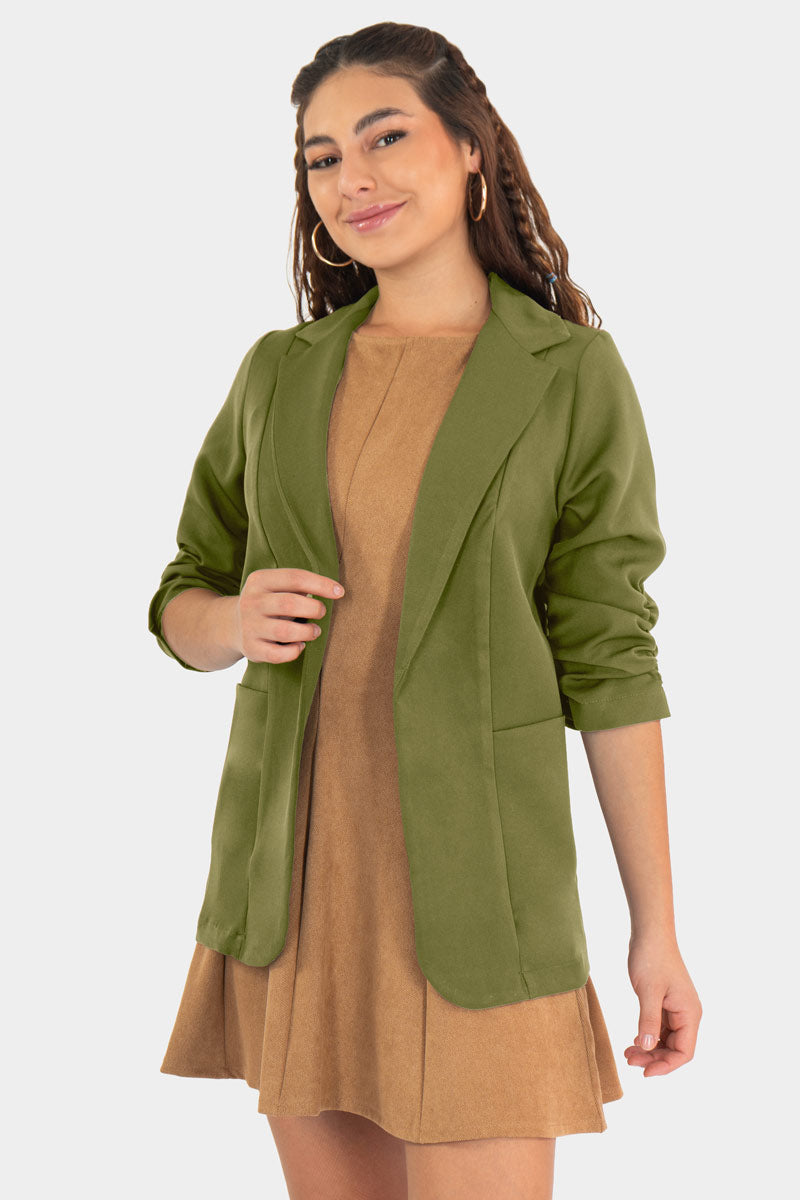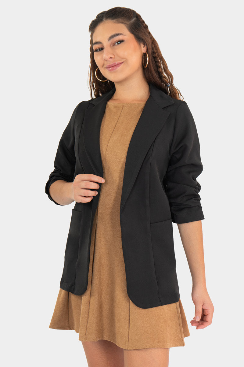Este blazer con aire casual redefine el estilo urbano: corte recto, hombros suaves y mangas ligeramente recogidas para un look relajado pero pulido. Se usa abierto sobre un suéter o vestido, aportando un toque chic sin esfuerzo. Perfecto para tu outfit diario con jeans o faldas, con actitud moderna y versátil.