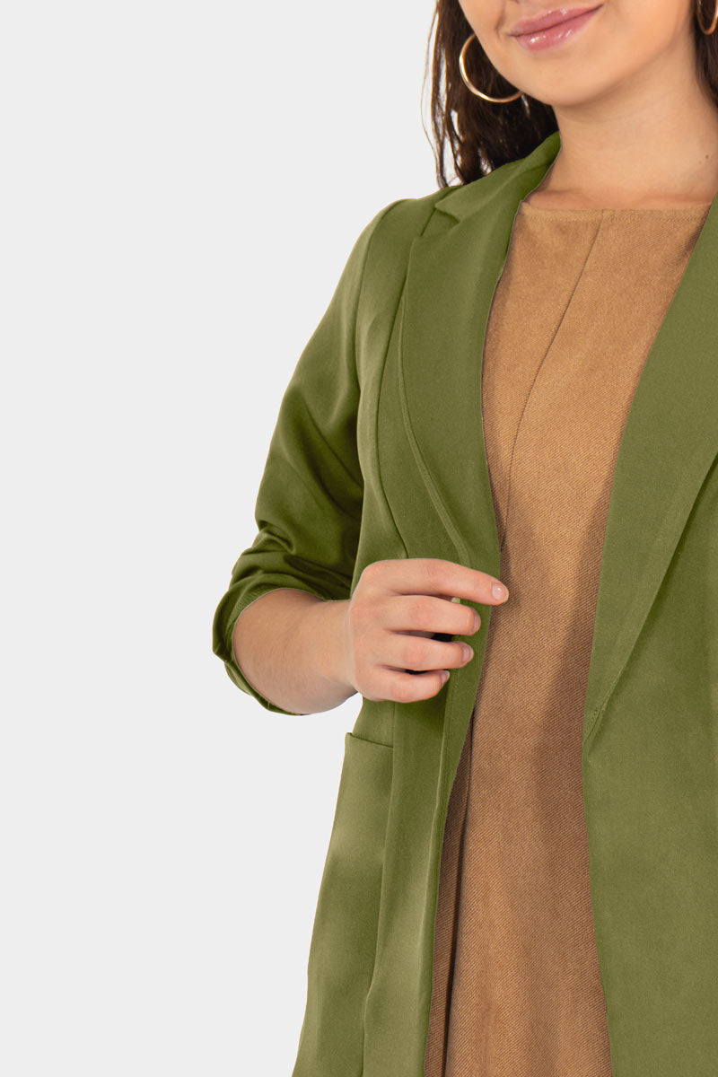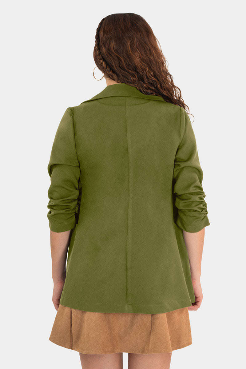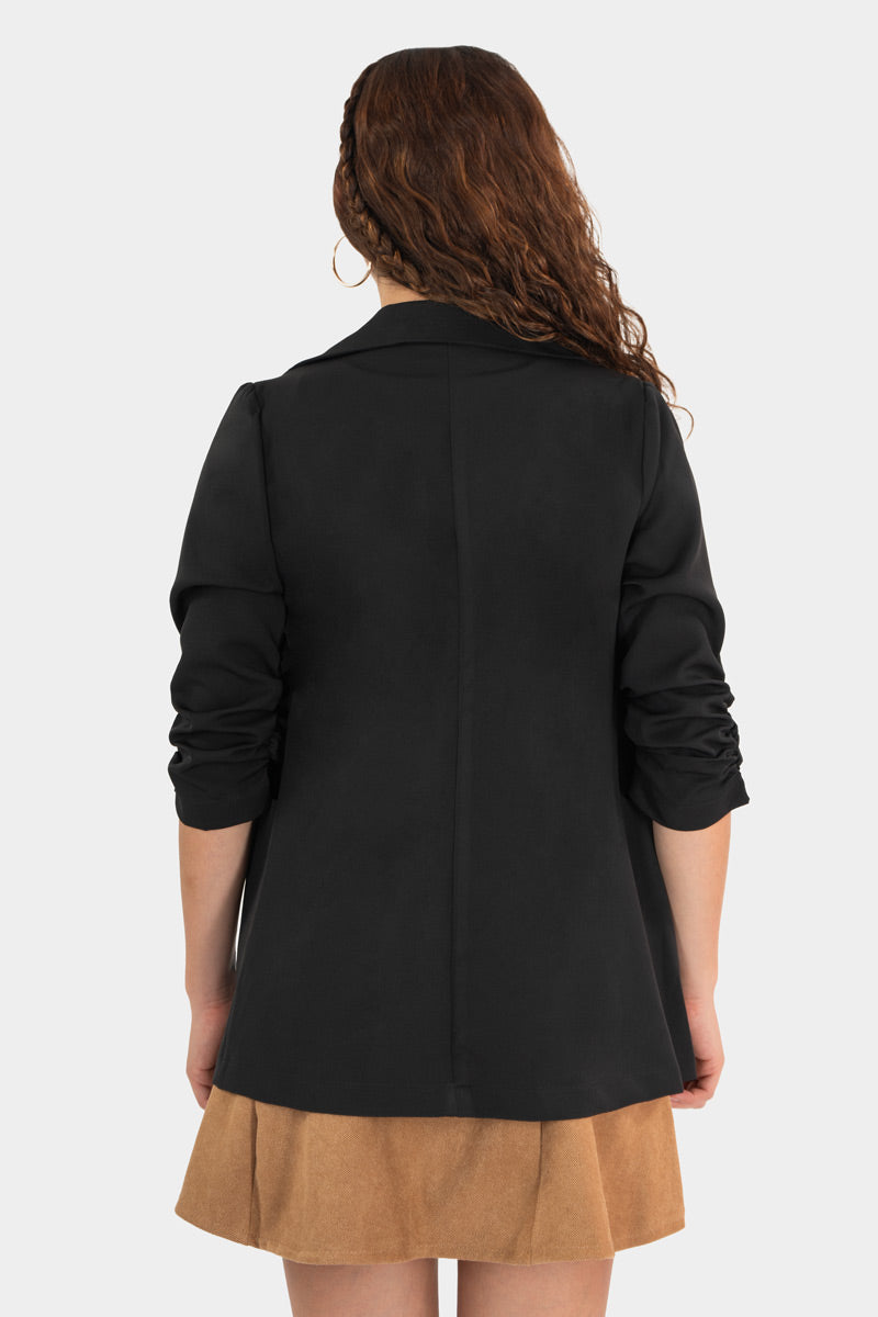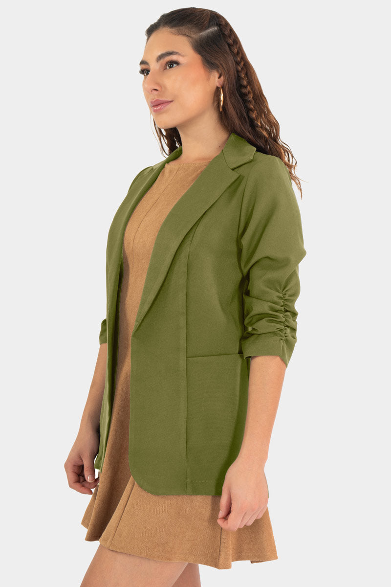 Este blazer con aire casual redefine el estilo urbano: corte recto, hombros suaves y mangas ligeramente recogidas para un look relajado pero pulido. Se usa abierto sobre un suéter o vestido, aportando un toque chic sin esfuerzo. Perfecto para tu outfit diario con jeans o faldas, con actitud moderna y versátil.