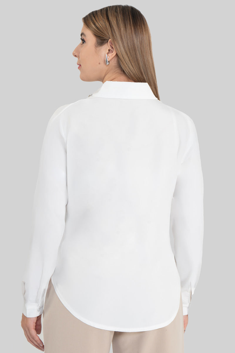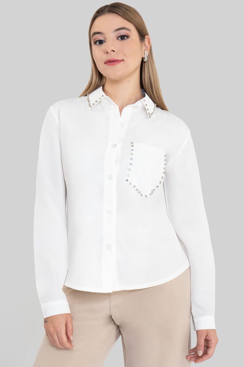 Dale un toque chic a tu outfit con esta blusa fresca y elegante. Su diseño clásico de botones se combina con un detalle súper trendy con aplicaciones de brillantes en el bolsillo, cuello y botones que elevan cualquier look. Perfecta para usar en la oficina, en una salida con amigas o incluso para una cena casual. Combínala con jeans, faldas o pantalones y siempre vas a destacar.