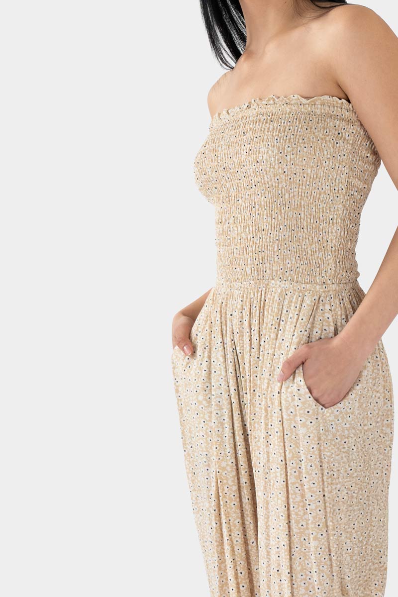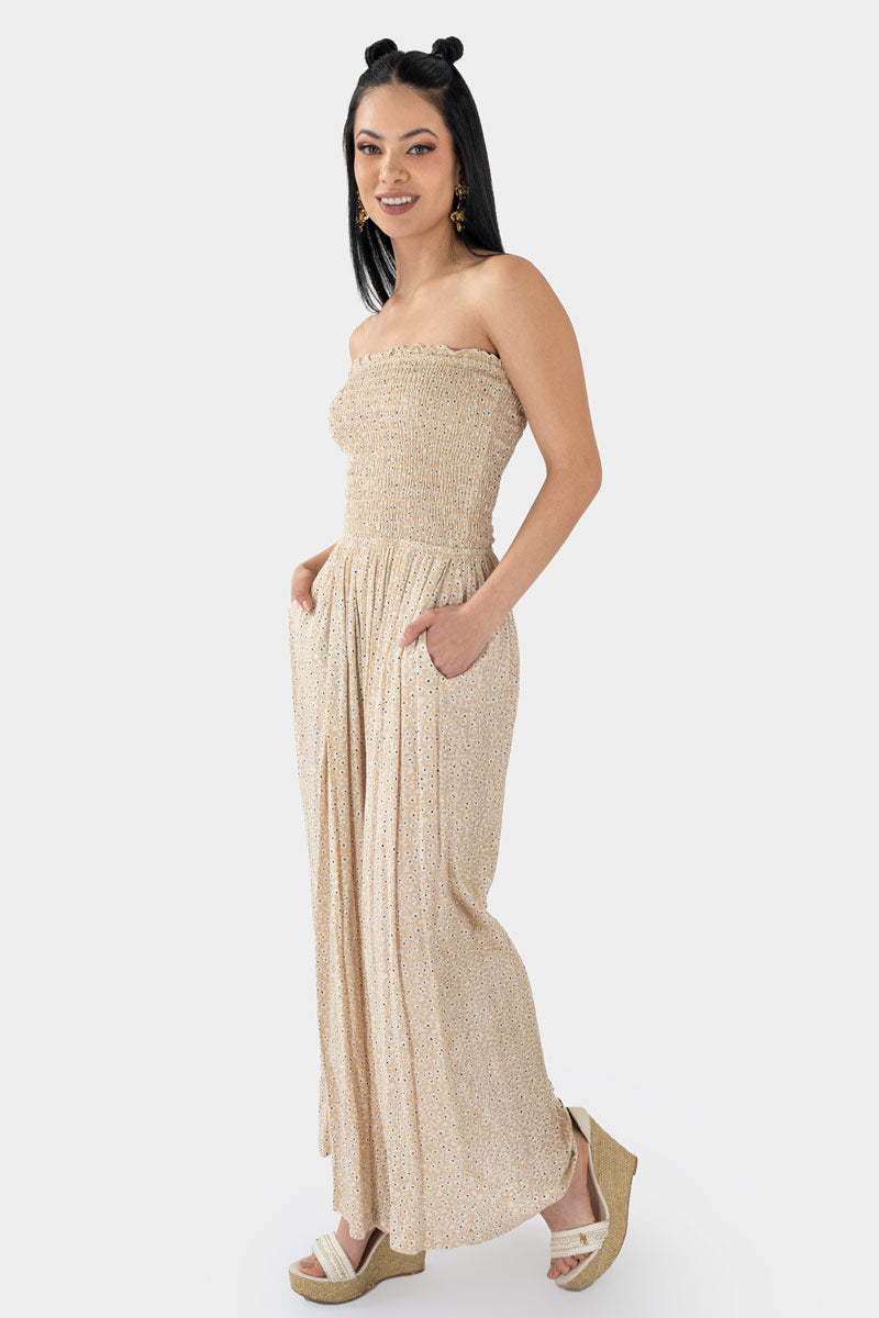Jumpsuit strapless en tono beige con textura ligera que combina elegancia natural y estilo moderno. Su ajuste en la parte superior estiliza la figura, mientras el corte de pierna amplia aporta movimiento y comodidad, creando un look sofisticado pero relajado. Perfecto para lograr outfits frescos y versátiles, ideal para combinar con sandalias o plataformas y destacar con un estilo femenino, actual y lleno de personalidad.