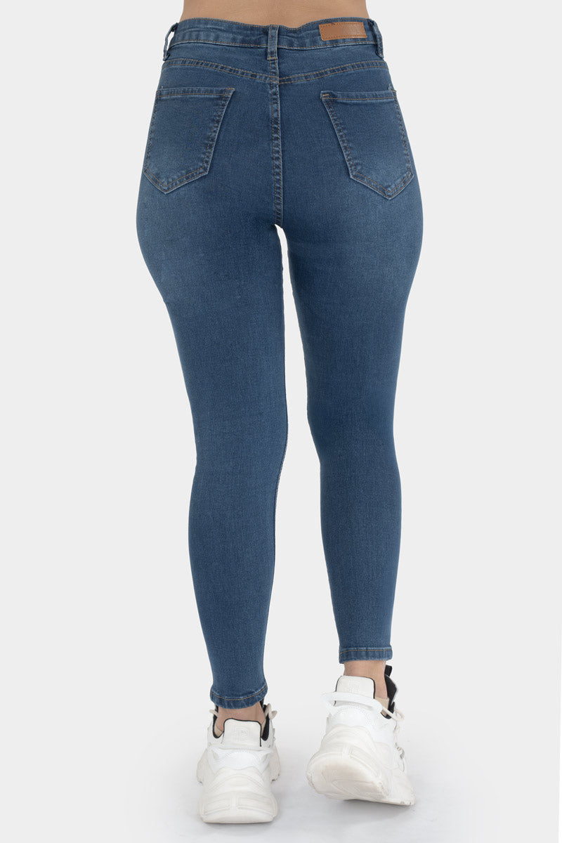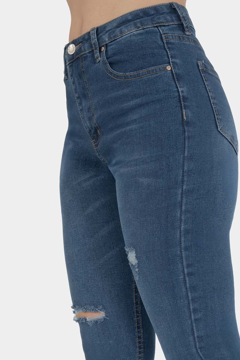 Estos jeans skinny de mezclilla azul con roturas al frente le dan ese toque rebelde y moderno que levanta cualquier outfit. Su cintura alta define la silueta y el fit ajustado aporta un estilo fresco y juvenil. Perfectos para combinar con tenis chunky y armar un look casual con mucha personalidad.