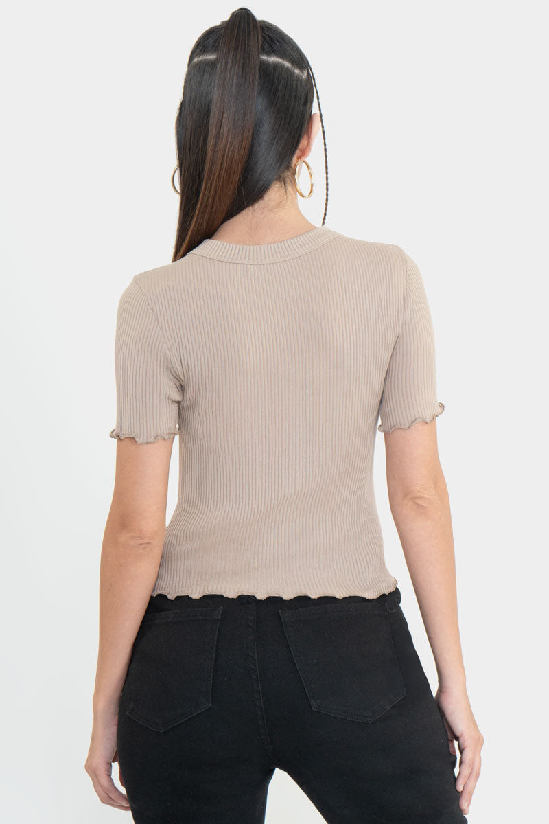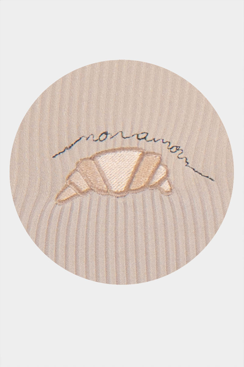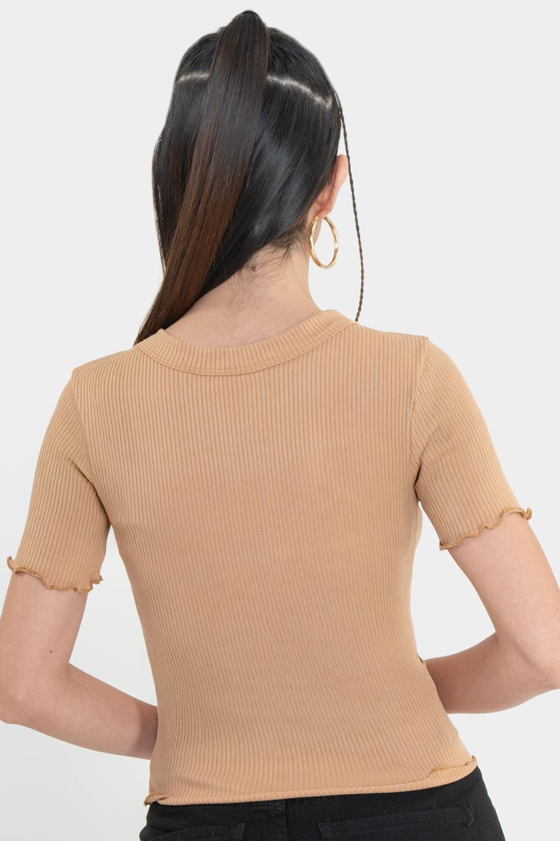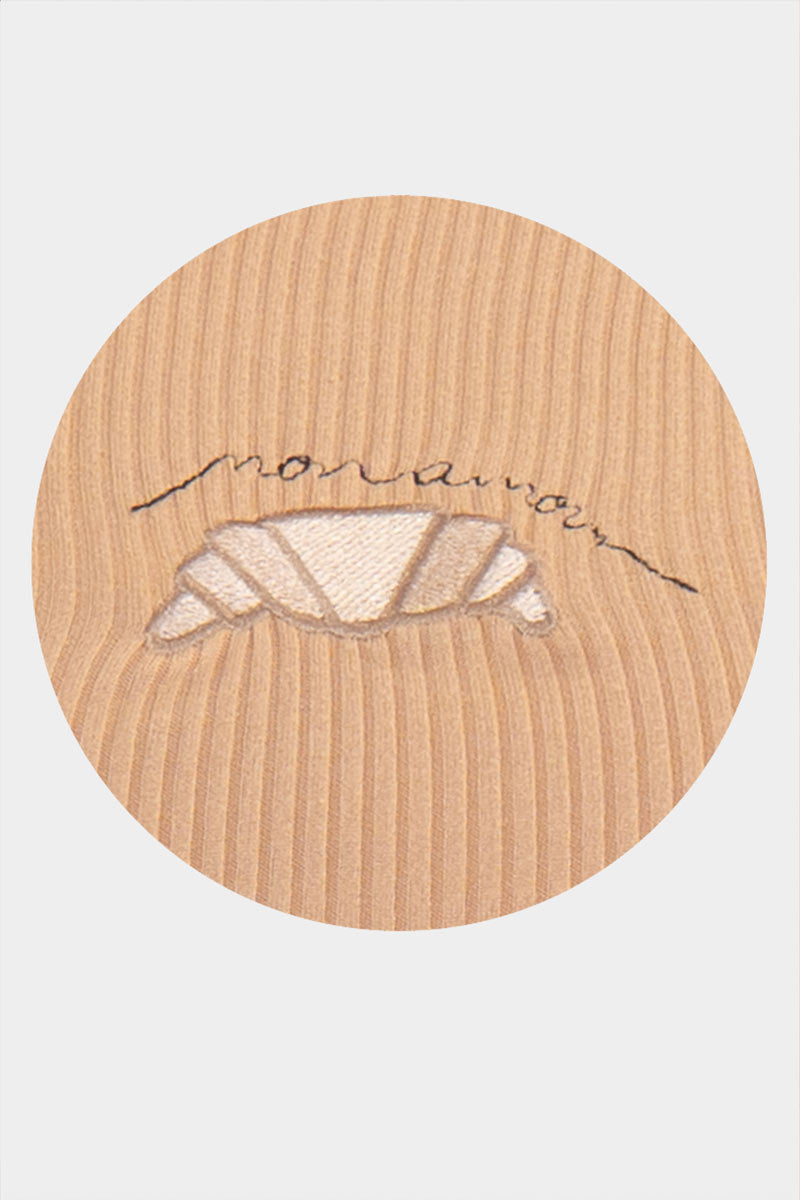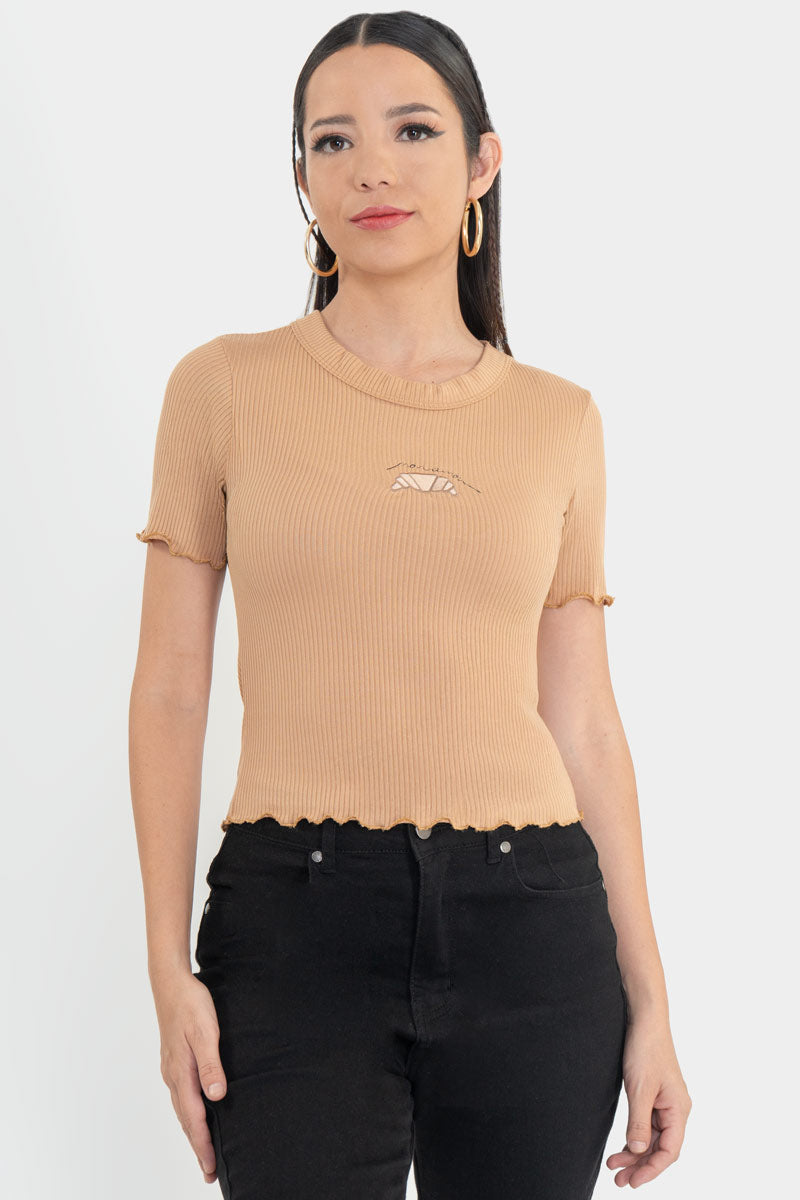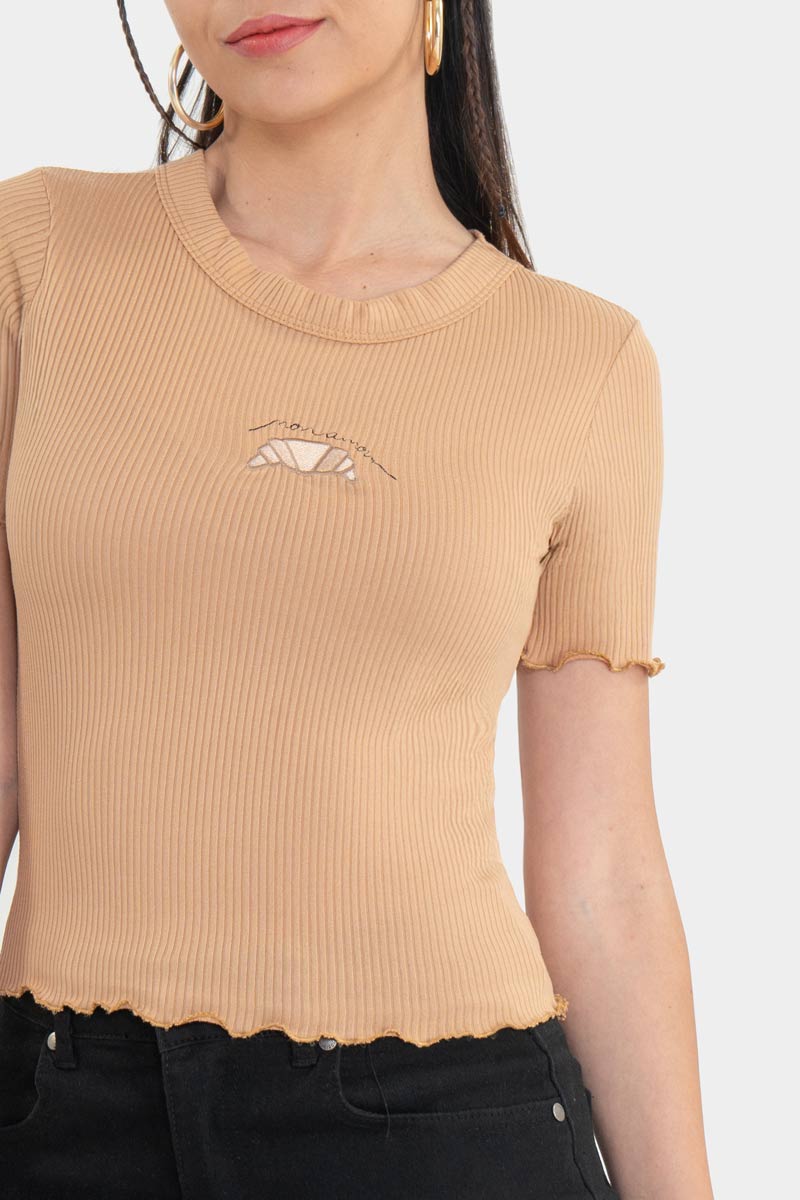 Si tu debilidad son los detallitos cute, esta playera te va a encantar. Confeccionada en tela canalé elástica y ligera, se ajusta súper bien a tu figura, mientras que los acabados ondulados en mangas y bajo le dan ese toque delicado y femenino. El bordado mini de croissant en el pecho, ideal para darle un aire divertido y original a tu outfit. Perfecta para combinar con jeans, faldas o pantalones relajados, ¡serás la más estilosa en cualquier plan casual!