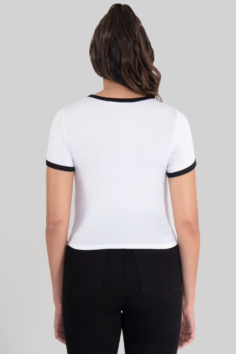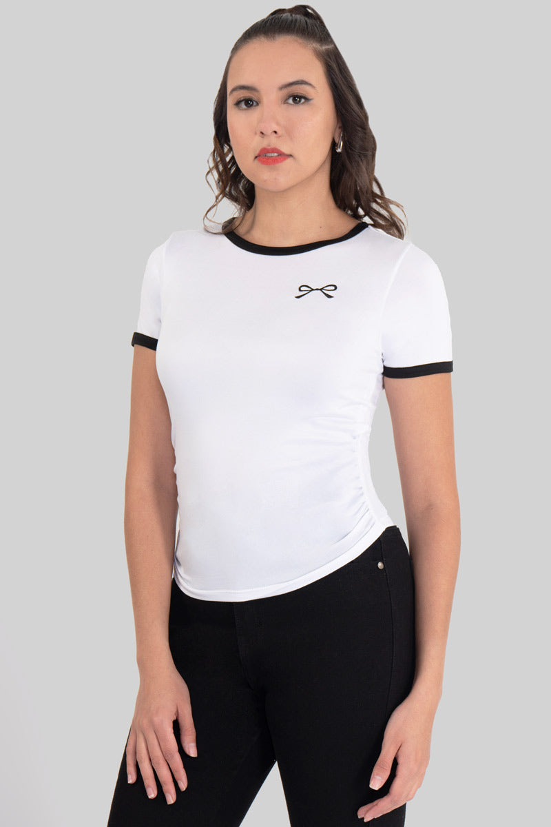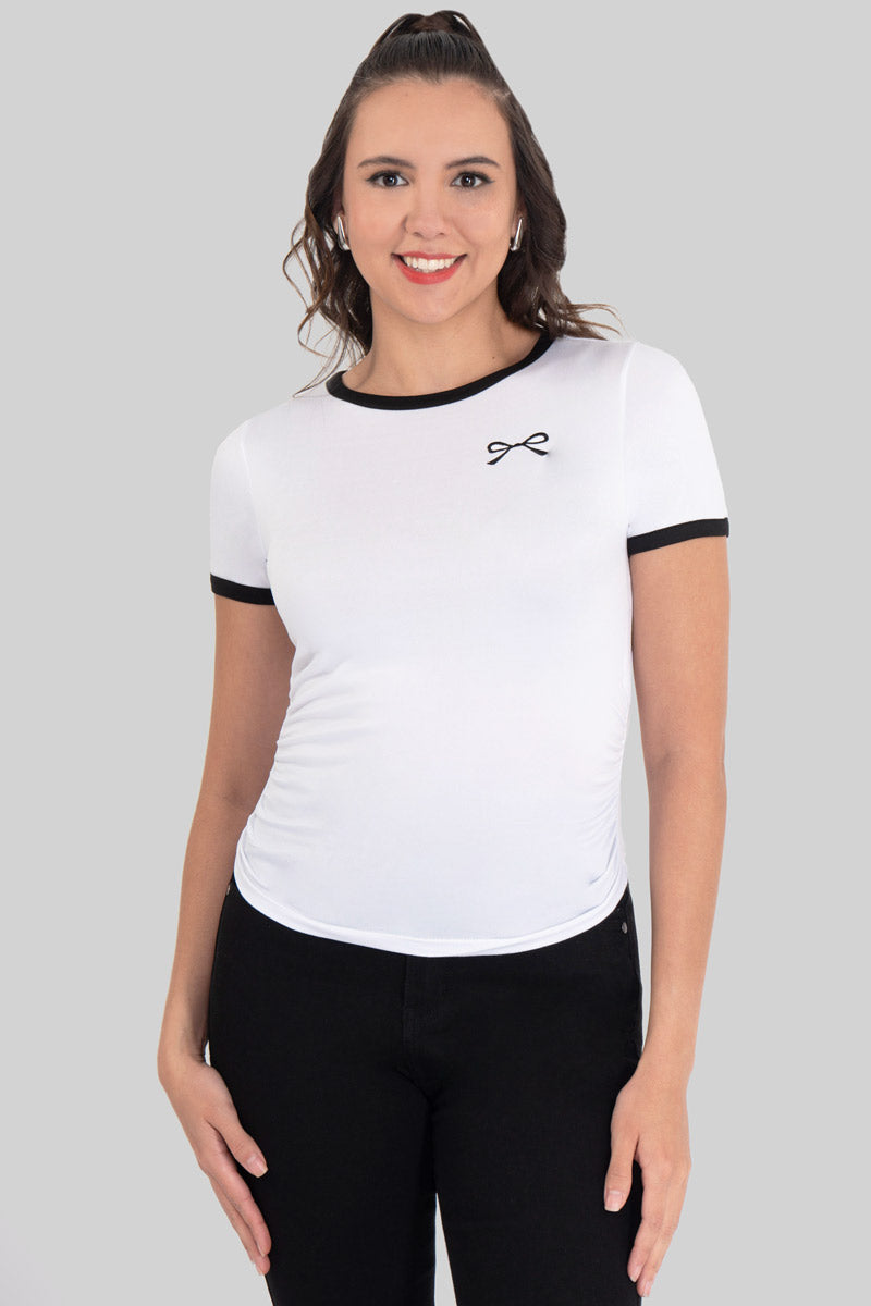 Luce fresca y con estilo con esta blusa de corte ajustado, perfecta para un look casual con un toque coqueto. El detalle del moñito bordado y los ribetes negros en cuello y mangas le dan ese aire moderno y femenino que te encantará. Ideal para combinar con jeans o faldas, esta blusa se convertirá en tu favorita para el día a día. ¡Comodidad, estilo y actitud en una sola prenda!
