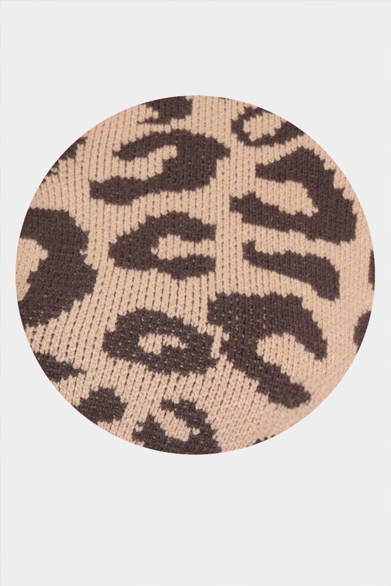 Suéter corto tipo cárdigán con estampado de leopardo en tonos beige y negro, cierre de botones y ribetes suaves en la cintura y los puños. Calza una silueta favorecedora, ideal para combinar con tops simples y jeans ajustados para lograr un look casual con un toque atrevido. Perfecta para salir a diario o eventos informales con estilo.