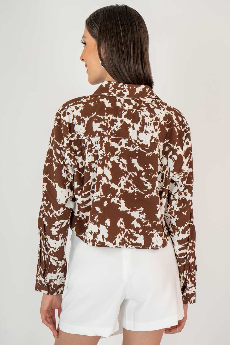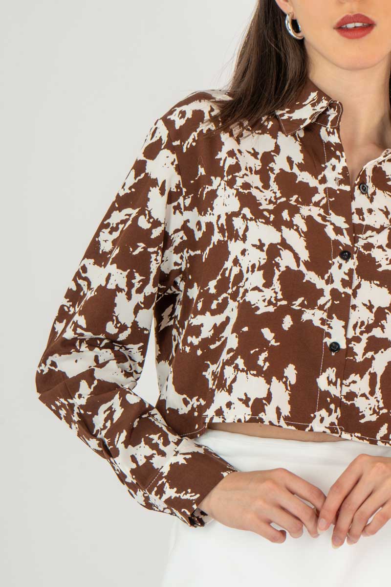 Esta camisa crop de manga larga es la mezcla perfecta de estilo y frescura! Con un estampado abstracto en tonos marrón y blanco, le dará un toque moderno y único a cualquier look. Perfecto para las chicas que buscan algo casual pero con mucha personalidad, puedes combinarlo con una falda blanca para un look chic o con jeans para algo más relajado. ¡Es una prenda versátil y trendy que no puede faltar en tu guardarropa.