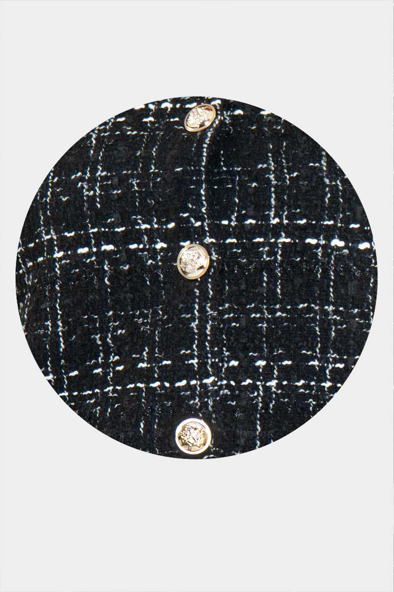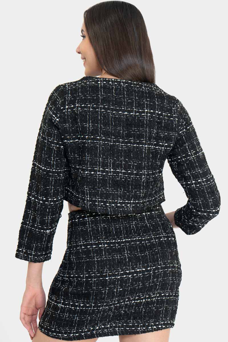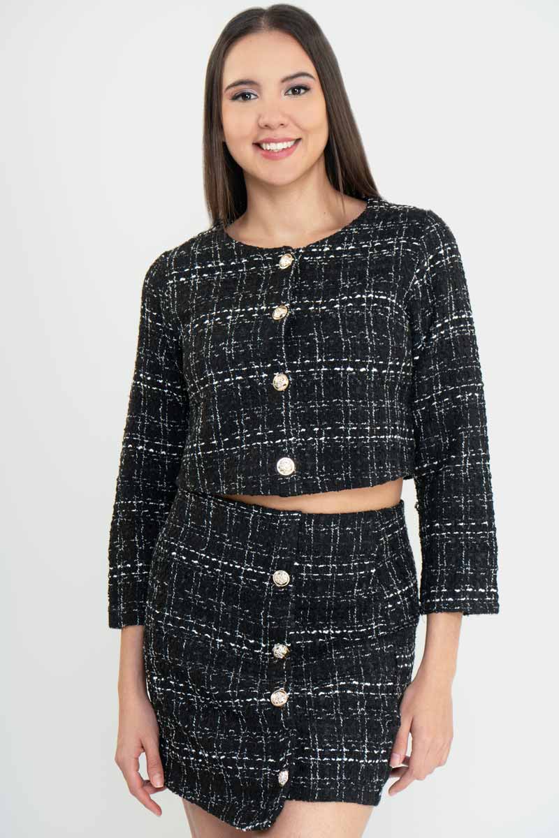 Conjunto de dos piezas en tejido tipo tweed con estampado de cuadros, ideal para un look juvenil y sofisticado. La chaqueta corta con botones decorativos aporta un aire elegante y moderno, mientras que la falda a juego, también con botones al frente, resalta la silueta con frescura y estilo. Perfecto para ocasiones en las que quieras verte chic, segura y a la moda, combinando comodidad con un toque distinguido.