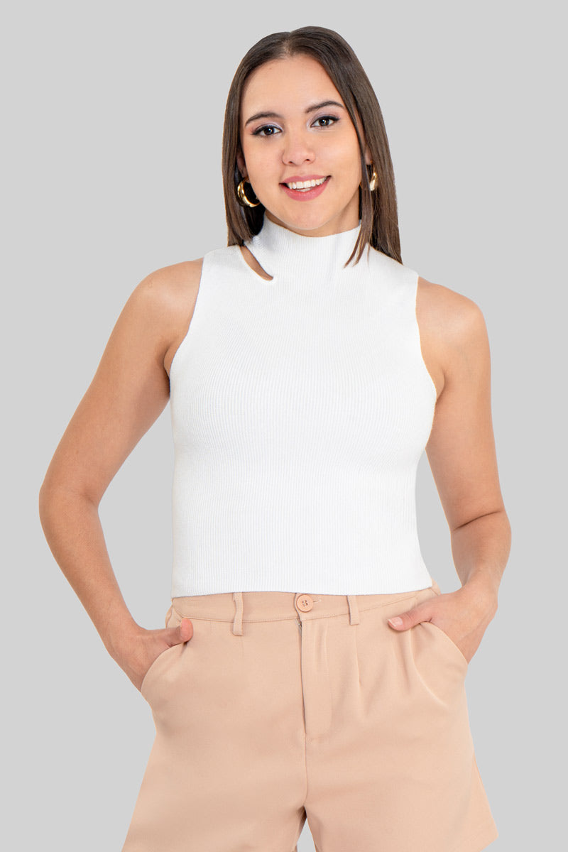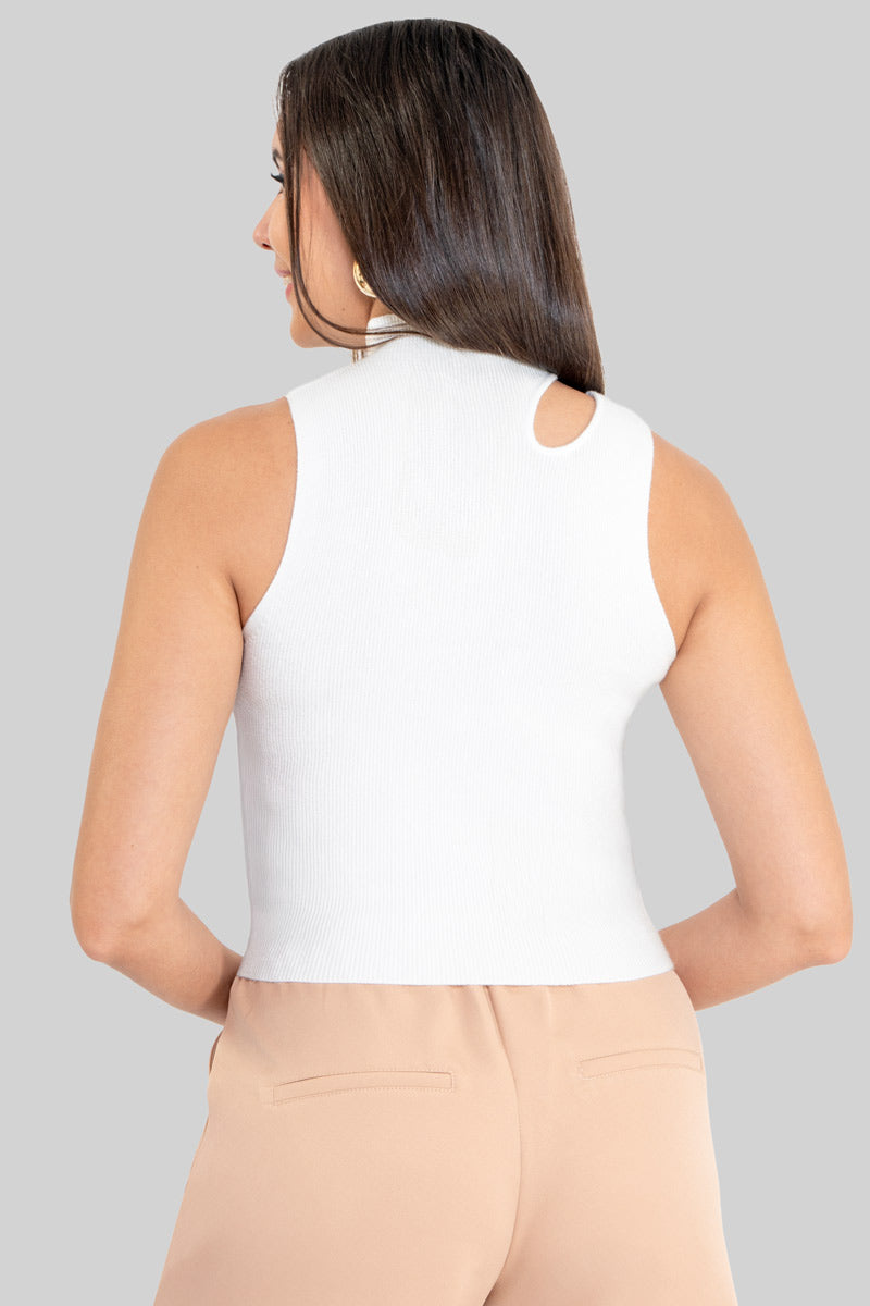 Blusa tejida sin mangas con cuello alto cut out asimetria en hombro.