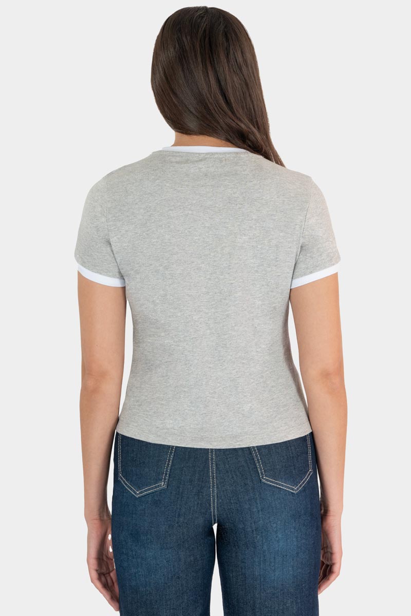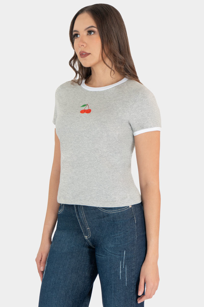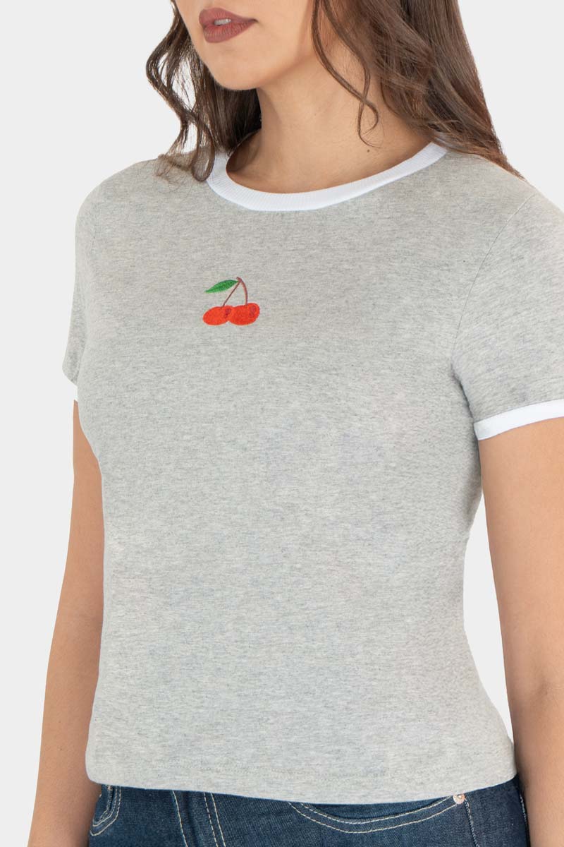 Esta playera de manga corta de color gris con borde blanco y un pequeño detalle de cereza en el pecho añade un toque divertido y moderno a looks casuales: ajuste cómodo, acabado suave y terminaciones contrastantes que realzan un estilo juvenil. Combínalo con jeans o shorts para un outfit urbano y fresco, listo para el día a día o planes informales. Una pieza versátil que aporta color y actitud sin perder comodidad.
