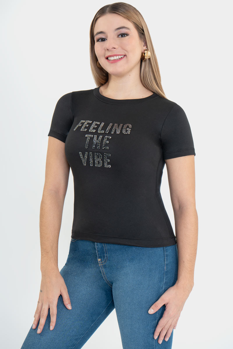 Actitud, brillo y estilo en una sola prenda. Esta playera ajustada con letras en acabado metálico es perfecta para destacar en cualquier ocasión. Su diseño cómodo y versátil te acompaña desde un look casual hasta una salida de noche. Ideal para combinar con jeans, faldas o pantalones de vinipiel. ¡Luce increíble y vibra alto!