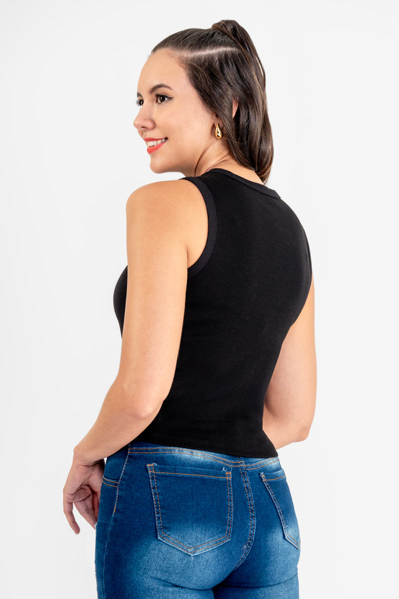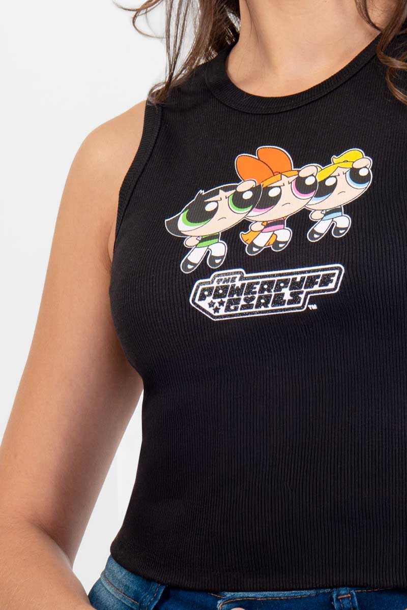 Playera sin manga con escote redondo y estampado chicas super poderosas.