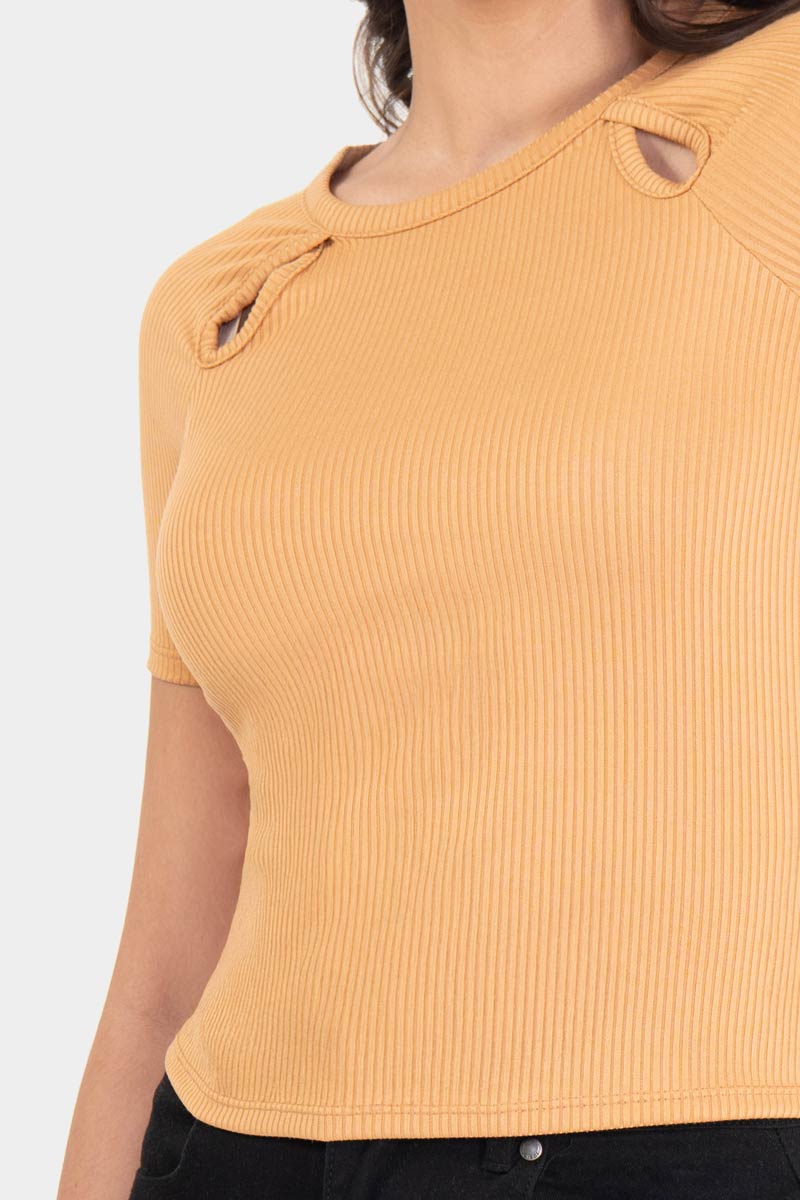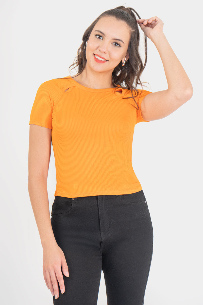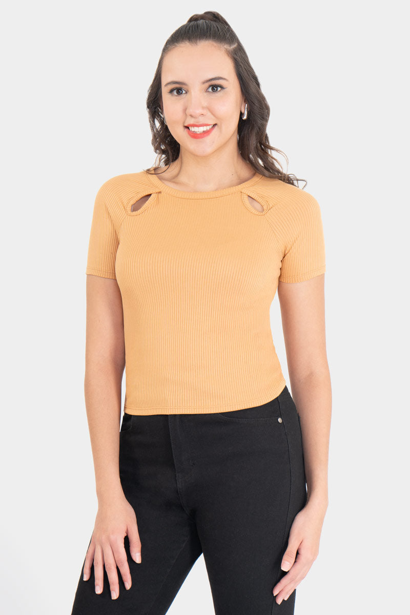 Playera manga corte con detalle de abertura en escote.