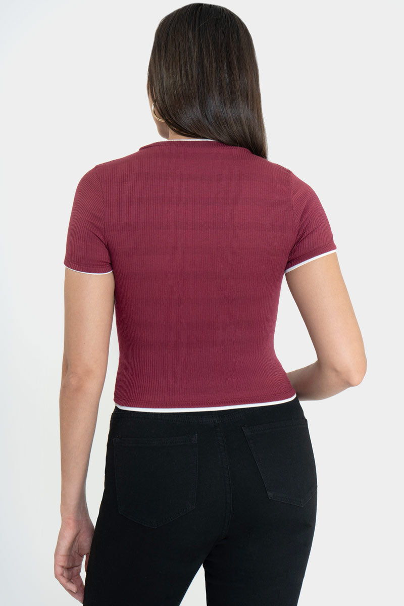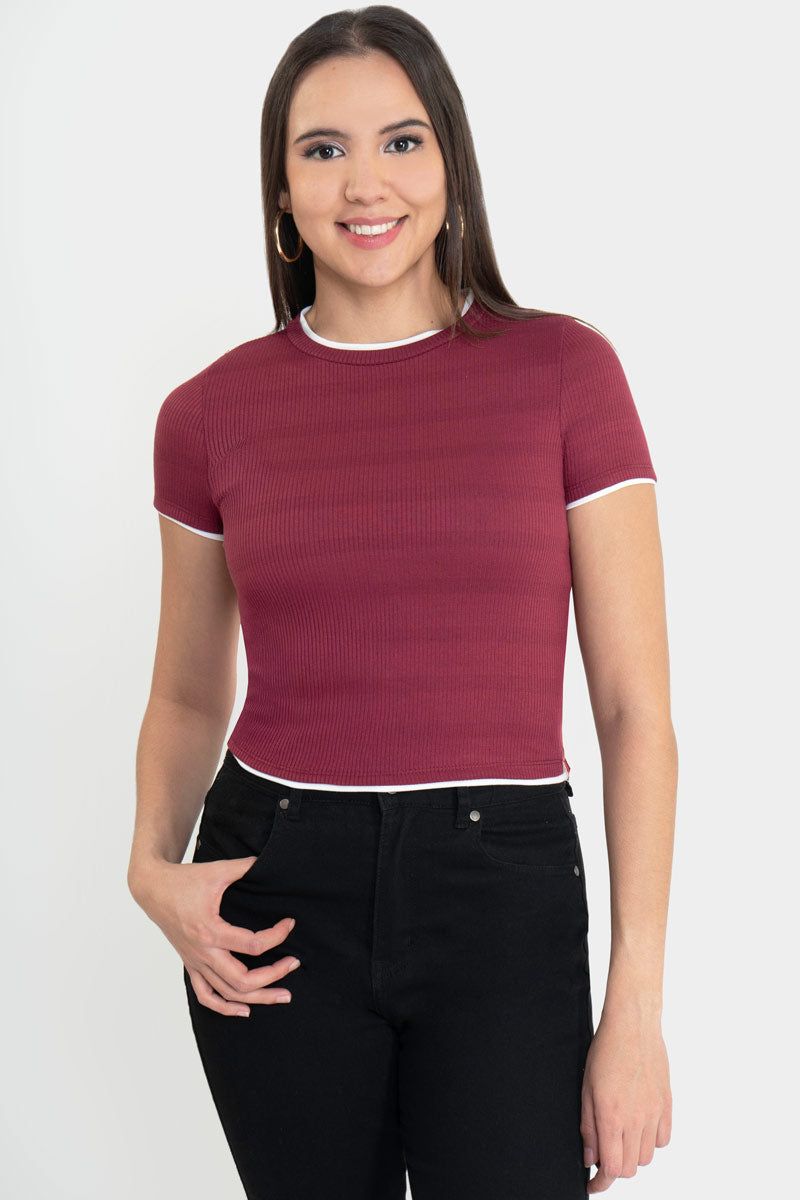 Esta blusa corta en tono vino es el toque ideal para elevar cualquier look casual. Su diseño ajustado y los bordes en contraste le dan ese aire moderno y coqueto que va con todo. Úsala con jeans, shorts o faldas y crea combinaciones frescas, cómodas y llenas de personalidad. ¡Una prenda clave para tu día a día!
