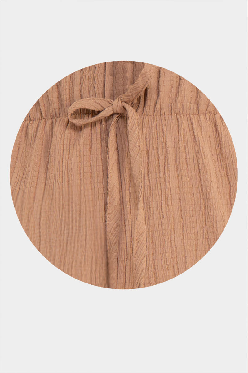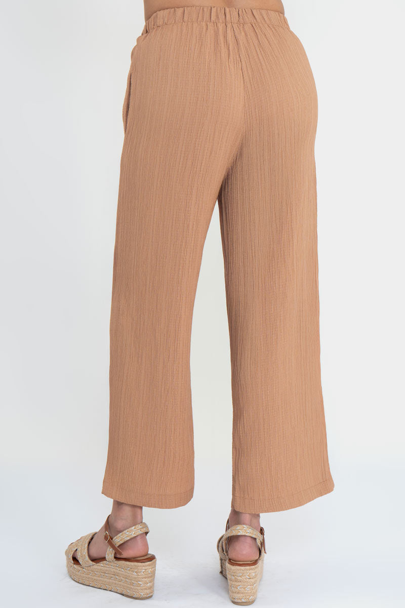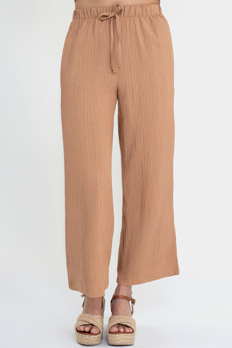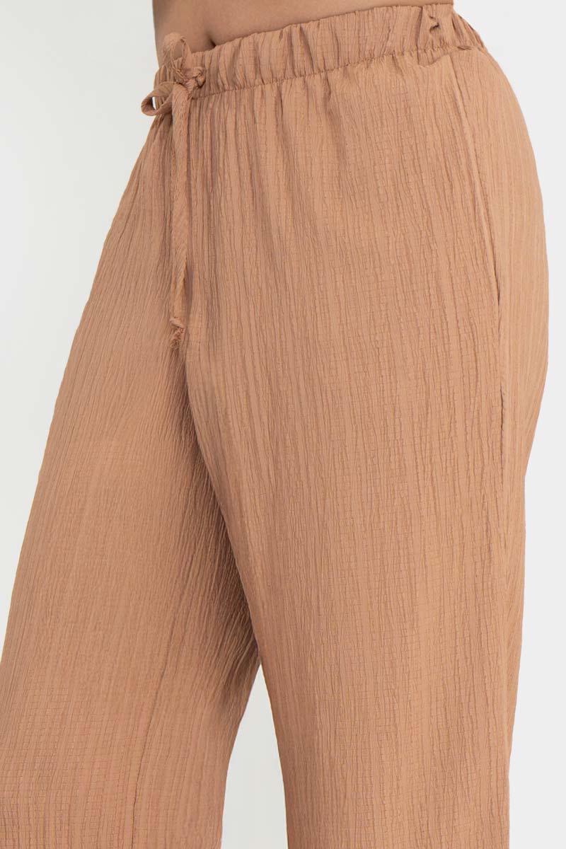 Este pantalón ligero es perfecto para lucir relajada sin perder el toque chic. Su corte amplio y tela fresca te acompañan en días soleados o salidas casuales. Con pretina elástica y moño ajustable, se adapta a ti con libertad y suavidad. Ideal para combinar con tops cortos o blusas fluidas.