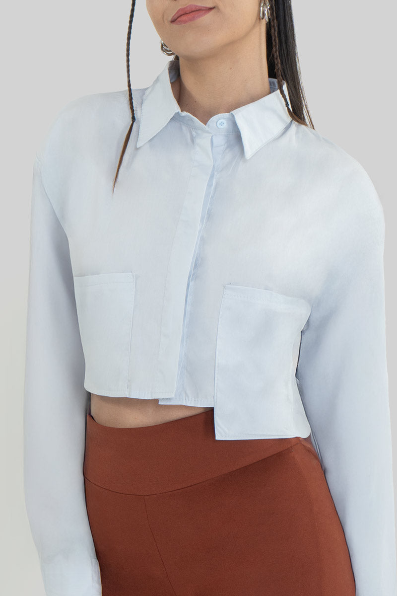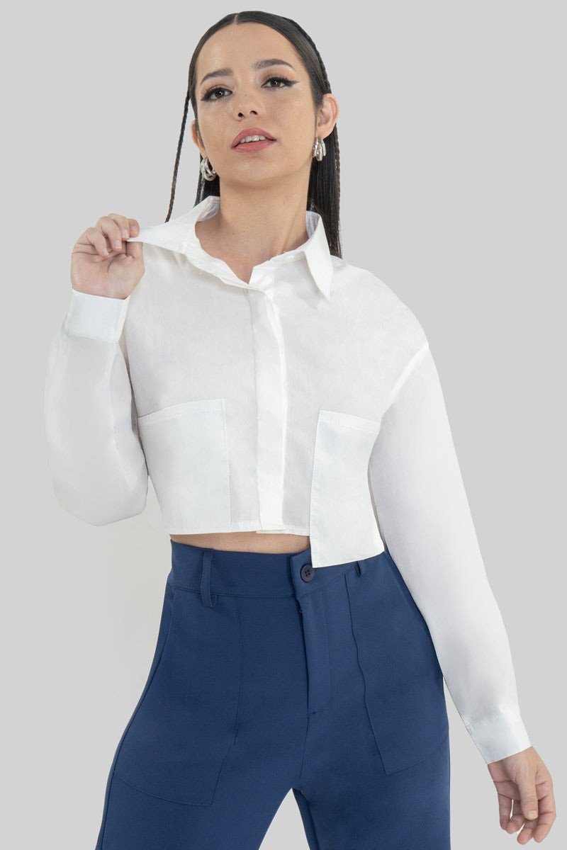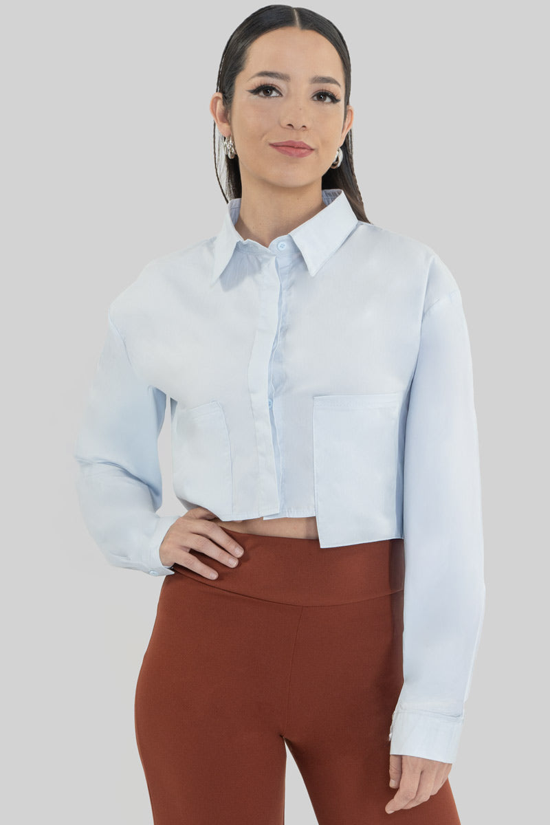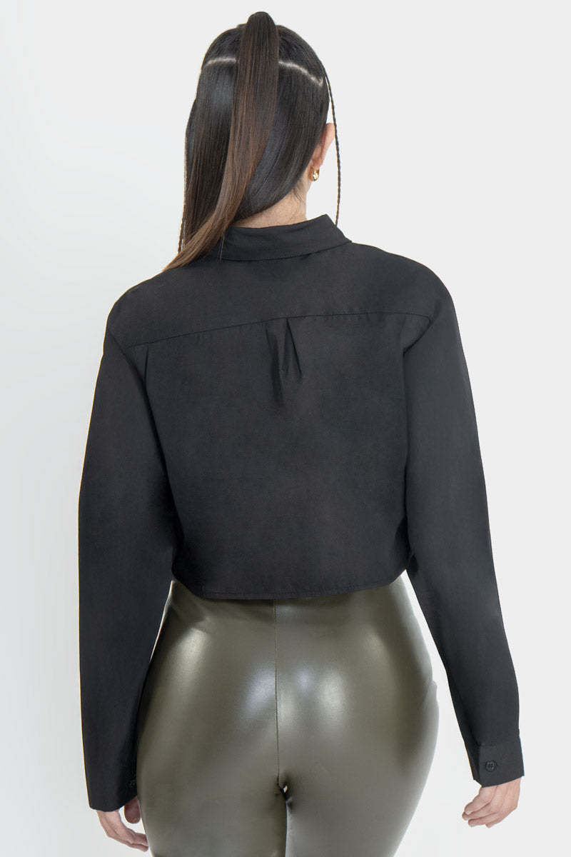 Luce elegante y atrevida con esta blusa negra de corte corto. Su diseño estructurado con bolsillos frontales y cuello clásico te da un estilo moderno, ideal para combinar con prendas de tiro alto. Perfecta para crear looks urbanos, sofisticados o con actitud. ¡Una prenda versátil que realza tu personalidad!