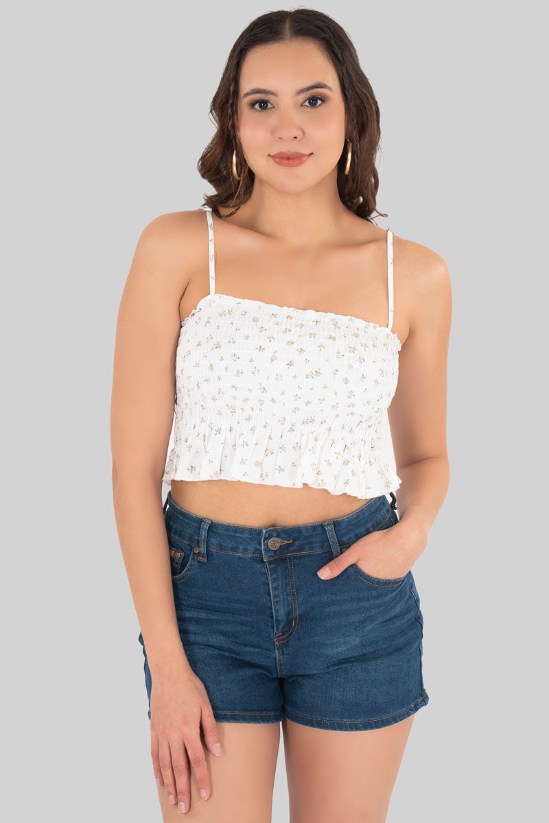 Blusa crop con tirantes delgados y diseño floral mini que grita verano 🌼✨ Su tela ligera con efecto smock se ajusta cómodamente al cuerpo y el ligero olan en la parte baja le da ese toque femenino y coqueto que nunca falla. Perfecto para combinar con shorts o jeans de tiro alto y lograr un look fresco, juvenil y súper versátil para cualquier plan casual.
