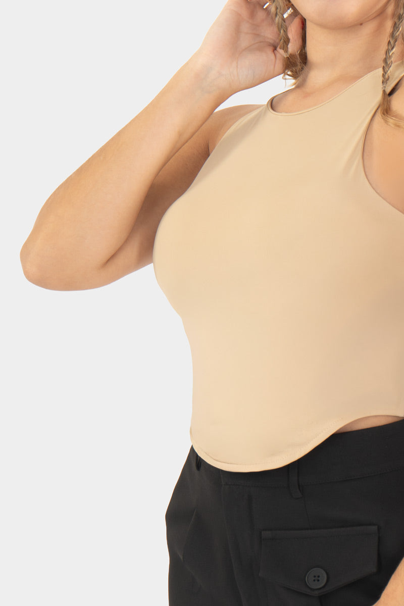 Playera de sin mangas en tono neutro que se ajusta al cuerpo y resalta tu silueta con un diseño limpio y súper versátil. Su corte moderno y ligero lo convierte en el básico ideal para combinar con shorts, jeans o pantalones de vestir y armar looks frescos, minimalistas y con mucha actitud. Perfecto para llevar solo o en capas, es de esas prendas que siempre te salvan el outfit.