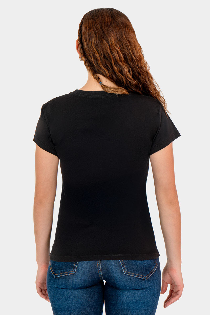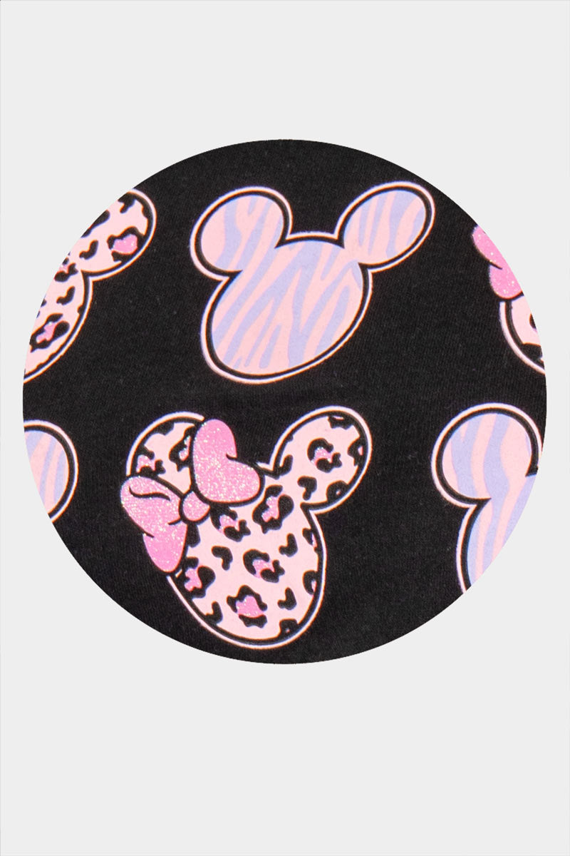 Playera de corte clásico en color negro con estampado de Minnie Mouse en tonos rosa y animal print. Ajuste ceñido y cuello redondo para un look rápido y cómodo. Ideal para combinar con jeans o faldas para un outfit casual y femenino con toque playful.