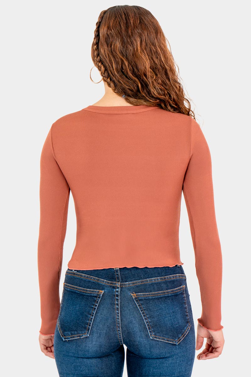 Descubre esta playera crop de punto suave en tono terracota, con ajuste cómodo y moderno. Su cuello redondo y mangas largas realzan un look juvenil y versátil, ideal para combinar con jeans o faldas para un estilo casual-glam en cualquier ocasión. El ribete acanalado y el detalle de escote y dobladillo con efecto irregular añaden un toque chic y desenfadado.