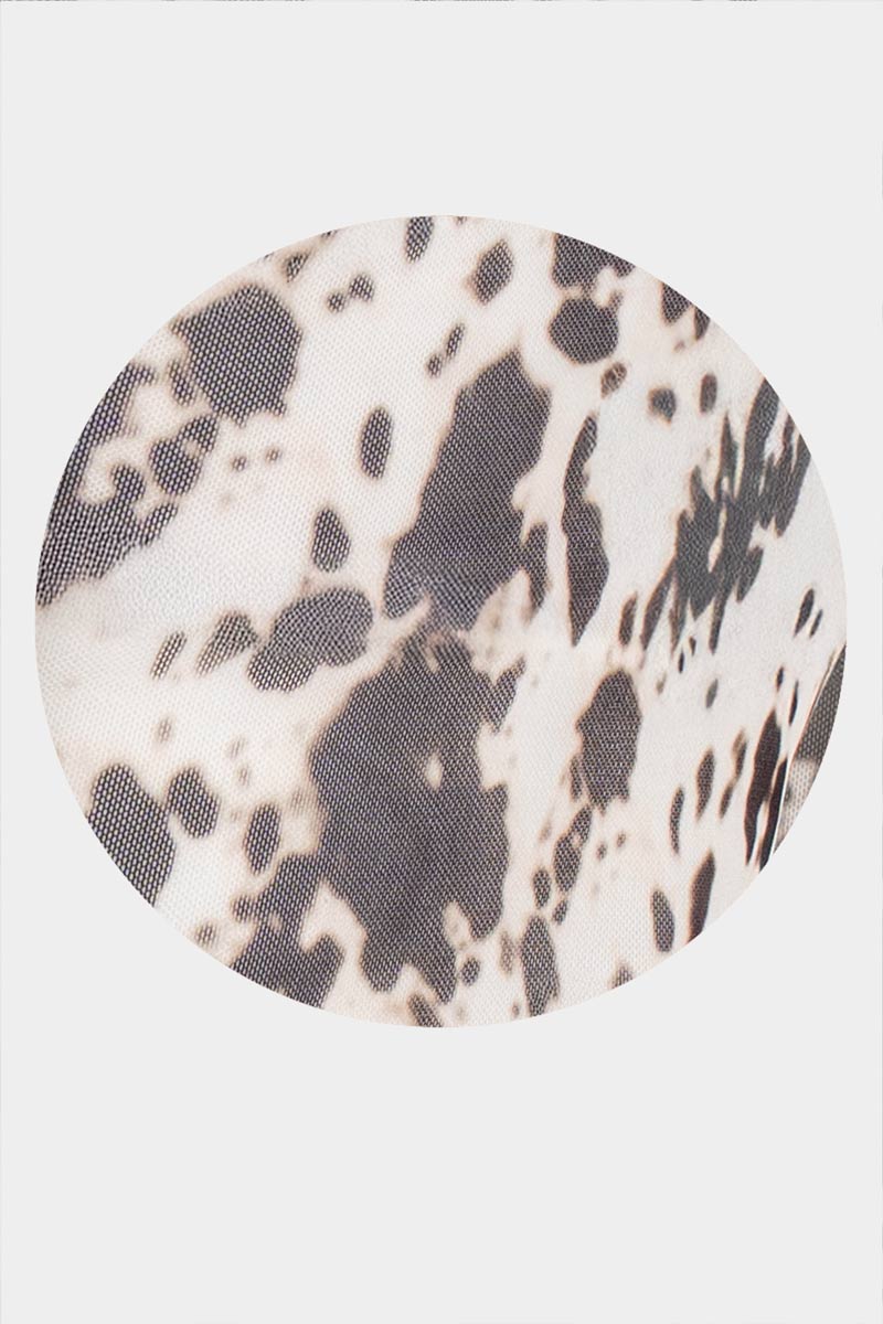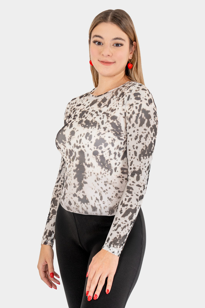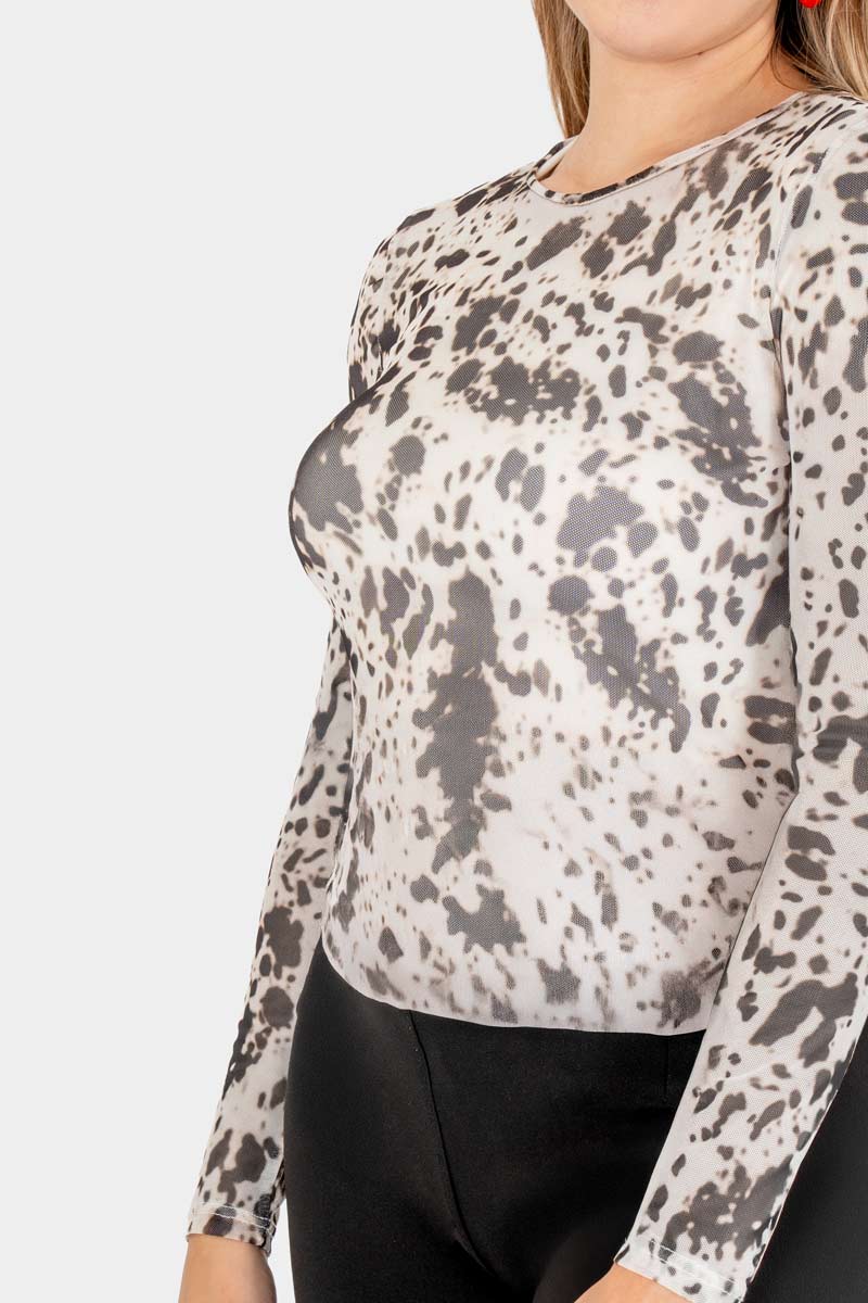 Esta blusa de manga larga con estampado tipo manchas en tonos neutros es perfecta para un look moderno, juvenil y súper original. Su fit ceñido y tela ligera de mesh la hacen ideal para combinar con jeans, faldas o leggings, creando outfits frescos y con mucha personalidad. Una prenda trendy que levanta cualquier outfit al instante.