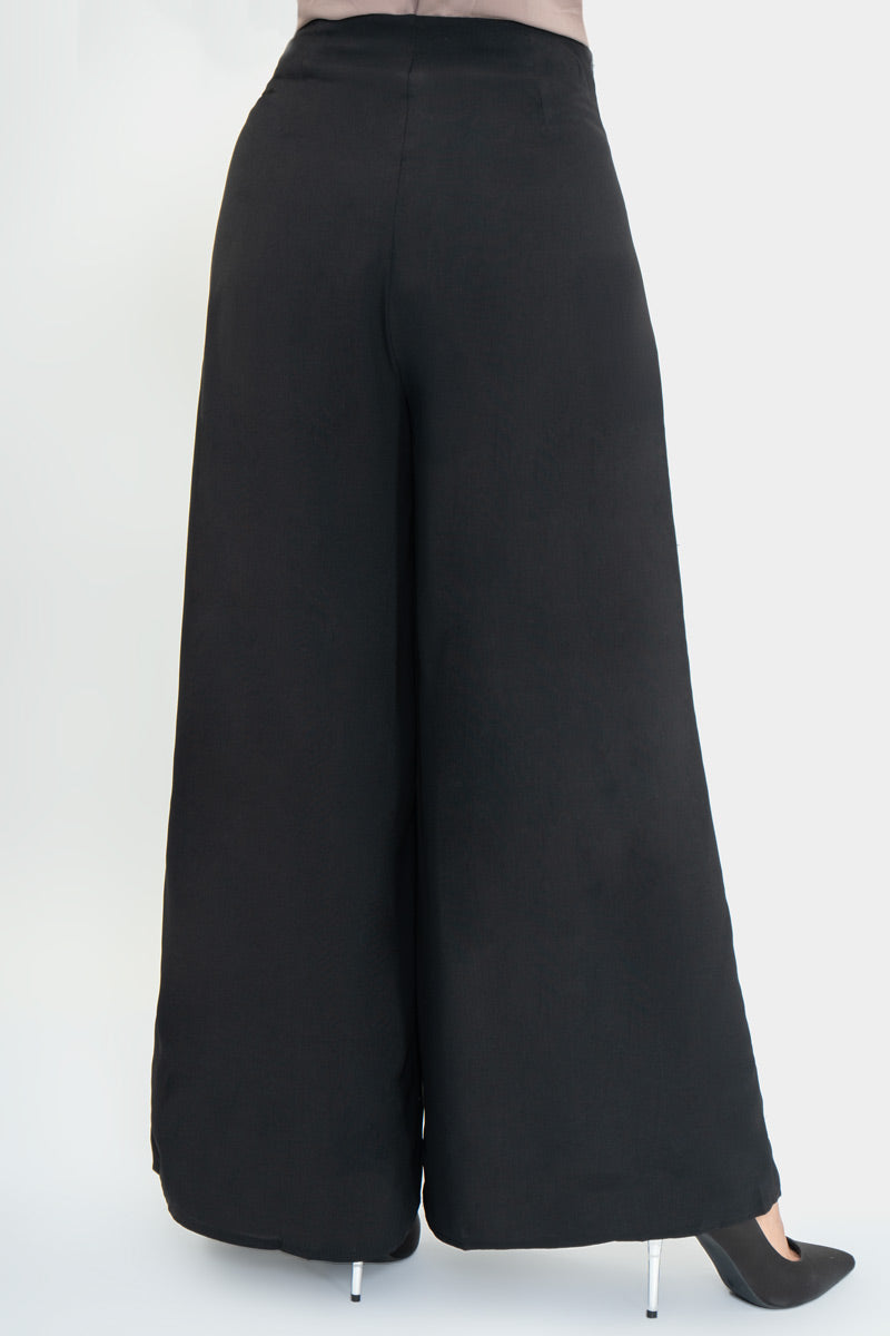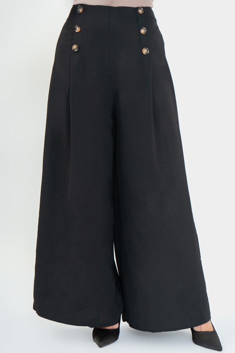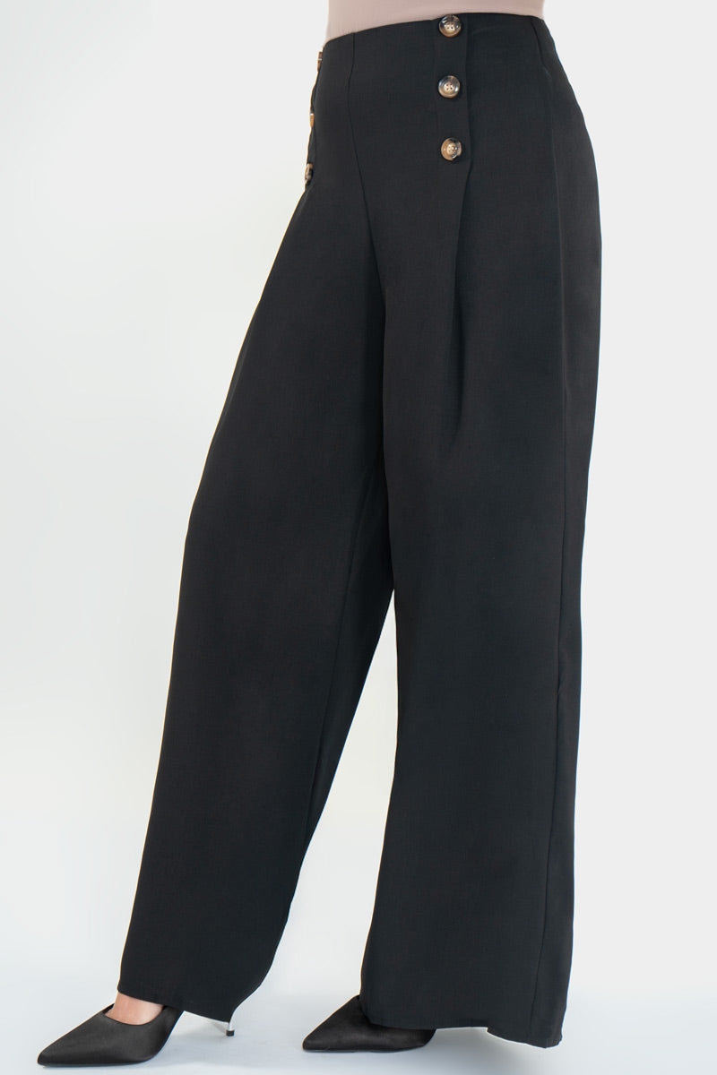 Pantalón de pierna ancha y tiro alto con botones al frente.