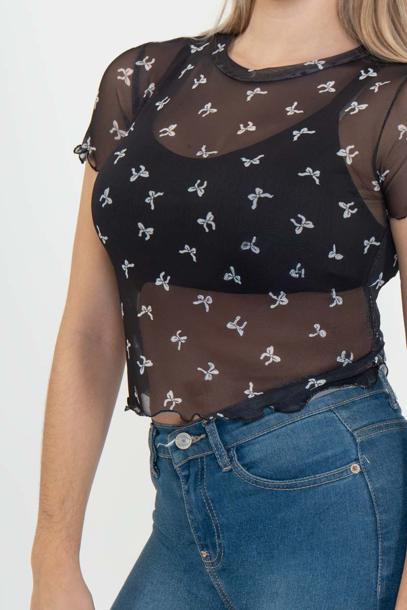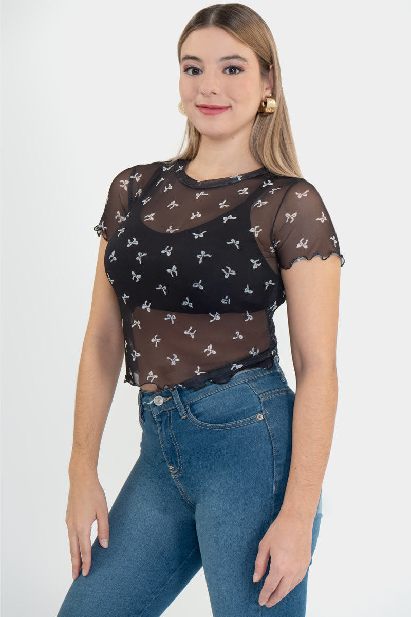 Esta playera de mesh negra con estampado de moñitos es perfecta para un look atrevido pero femenino. Su diseño semitransparente con detalle en ondas en mangas y dobladillo le da ese toque trendy que está súper IN. Úsala con un bralette o top debajo y combínala con jeans, faldas o pantalones de tiro alto para un outfit de impacto.