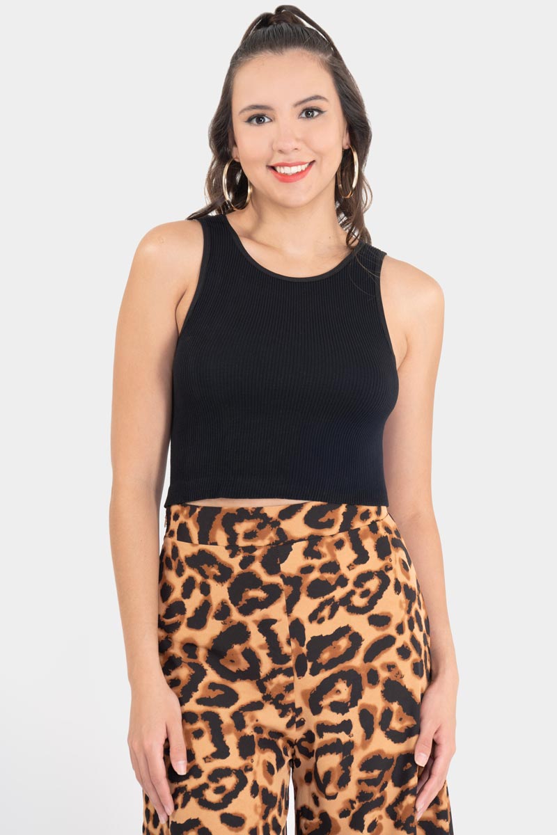Esta playera crop sin mangas de textura acanalada es ese toque versátil que eleva cualquier look. Su diseño ajustado resalta la silueta con elegancia y frescura, ideal para combinar con faldas, pantalones o lo que más te guste. Fresco, moderno y súper cómodo, es perfecto para días de calor o para armar un look de impacto con tu falda favorita, como esta con estampado animal.