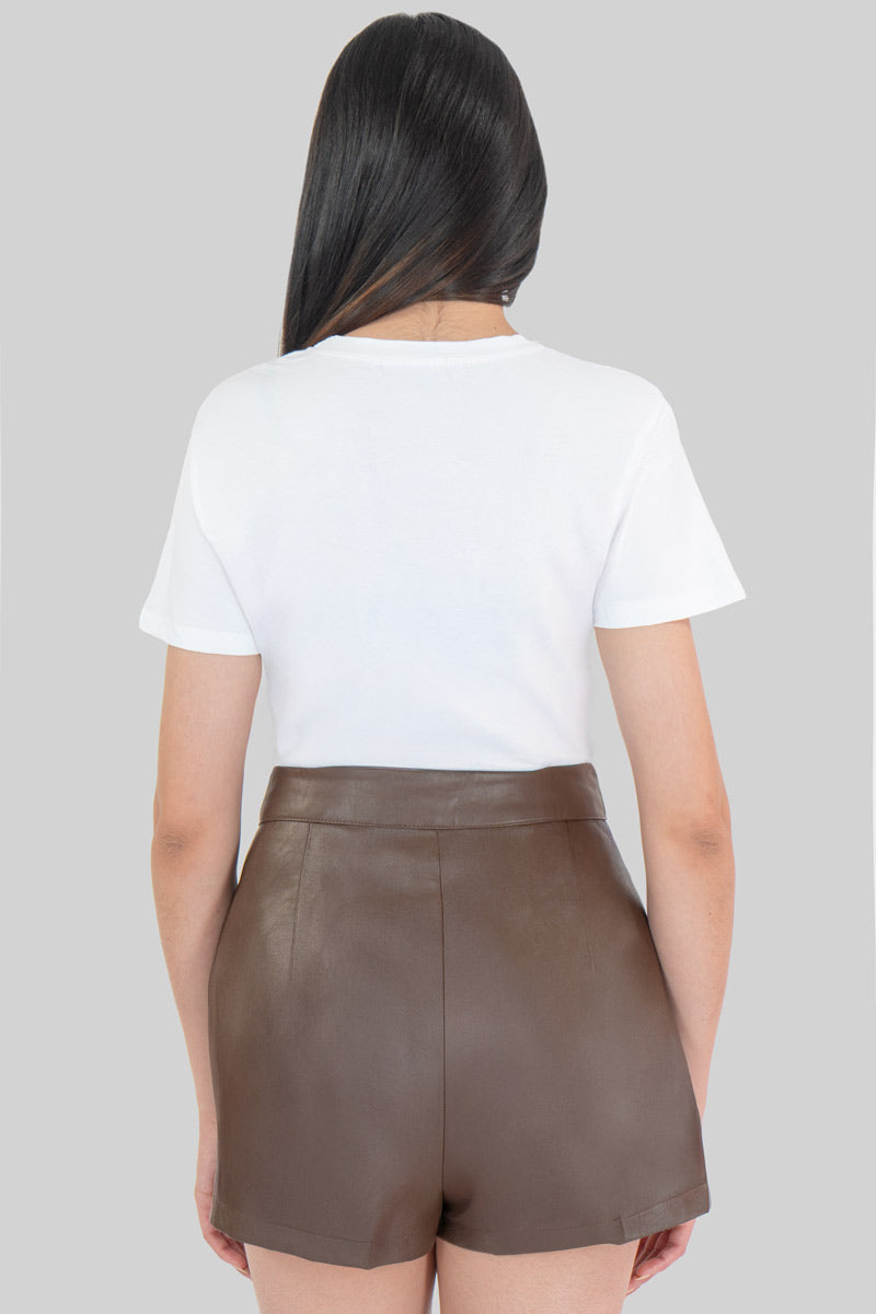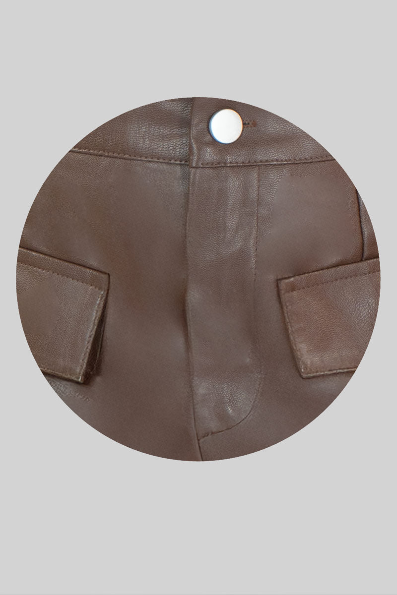 Short de cuero ecológico en tono café, con un diseño moderno y atrevido que combina estilo y comodidad. Su tiro alto realza la figura y aporta un aire sofisticado, mientras que los bolsillos frontales de solapa le dan un toque juvenil y diferente. Ideal para quienes buscan una prenda versátil que se puede usar tanto de día como de noche, creando looks frescos, originales y con mucha personalidad.