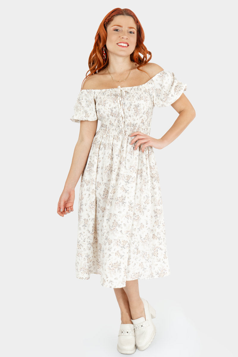 Este vestido midi con hombros descubiertos es pura vibra romántica y juvenil: su estampado floral suave y el elástico fruncido en el pecho crean una silueta fresca, favorecedora y súper femenina. Ligero, cómodo y perfecto para días soleados, es ese outfit que te hace sentir linda sin esfuerzo, ideal para planes casuales, paseos o una tarde entre amigas.