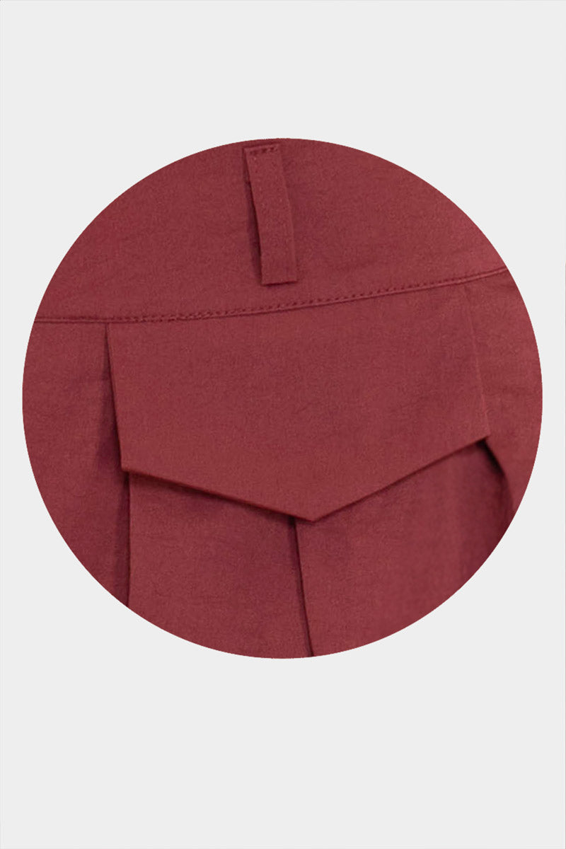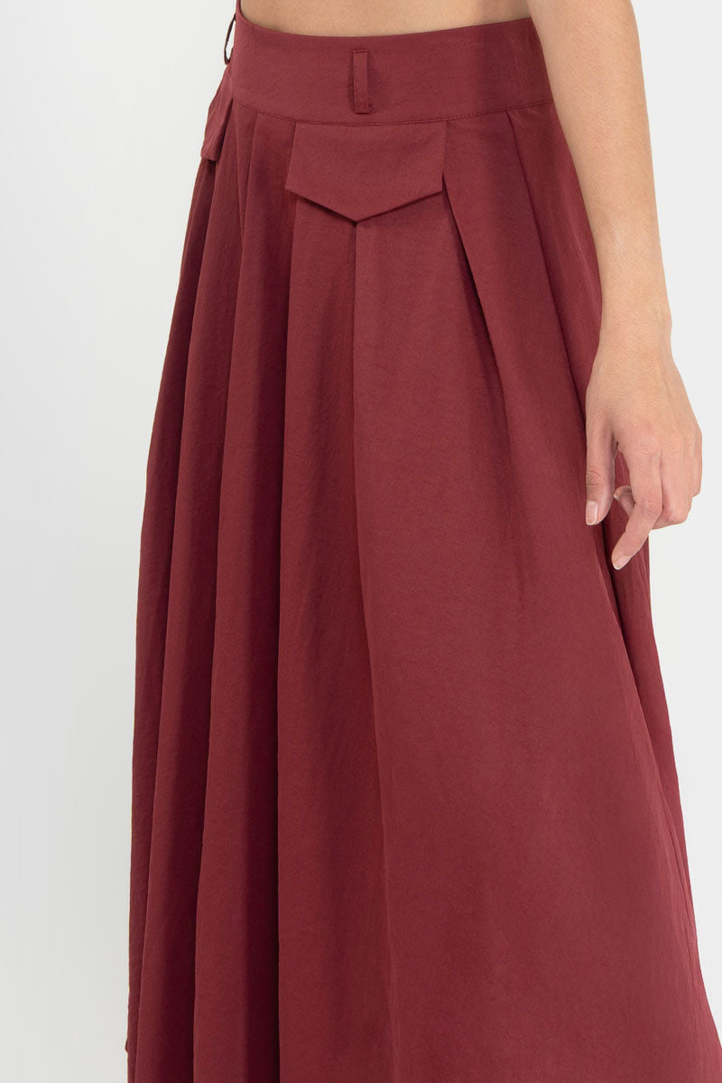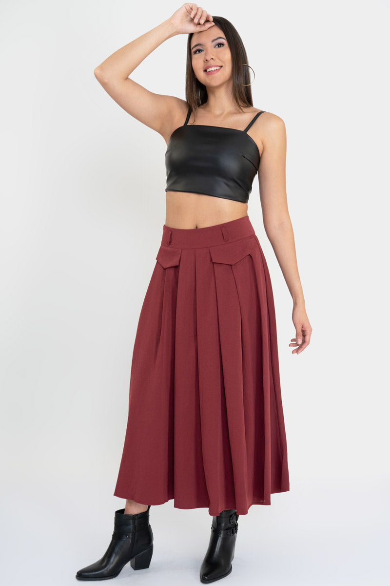 Luce auténtica y con mucho estilo con esta falda midi en un elegante tono vino. Su diseño con pliegues marcados y cintura alta resalta tu figura mientras te da libertad de movimiento y comodidad durante todo el día. Con detalles modernos como solapas decorativas en la pretina y un corte amplio que aporta fluidez, esta falda es ideal para crear combinaciones únicas y llenas de actitud.