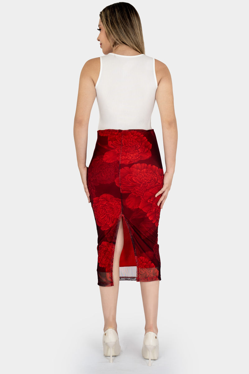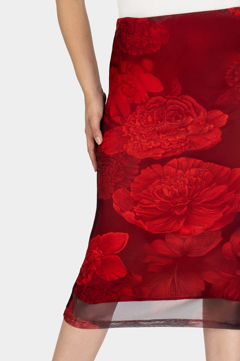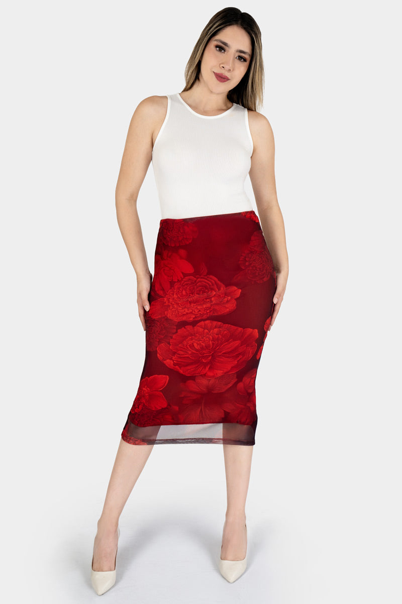 Deslumbra con una falda midi en tono rojo intenso con una elegante serigrafía de flores. Su caida recta y el acabado ligeramente translúcido en la base aportan un toque sexy y sofisticado sin perder la comodidad gracias al tejido elástico. Combínala con una blusa neutra y tacones para un look urbano chic, ideal para citas, eventos o una noche con amigas.