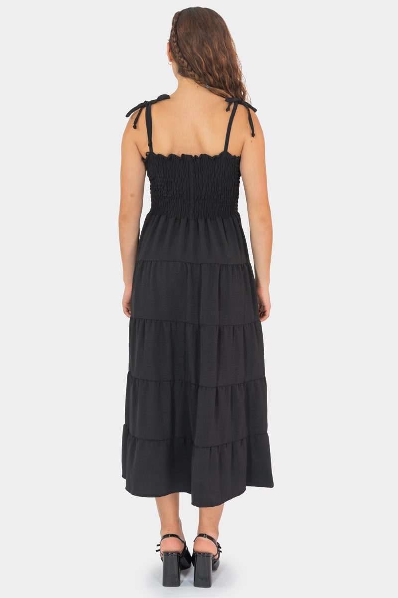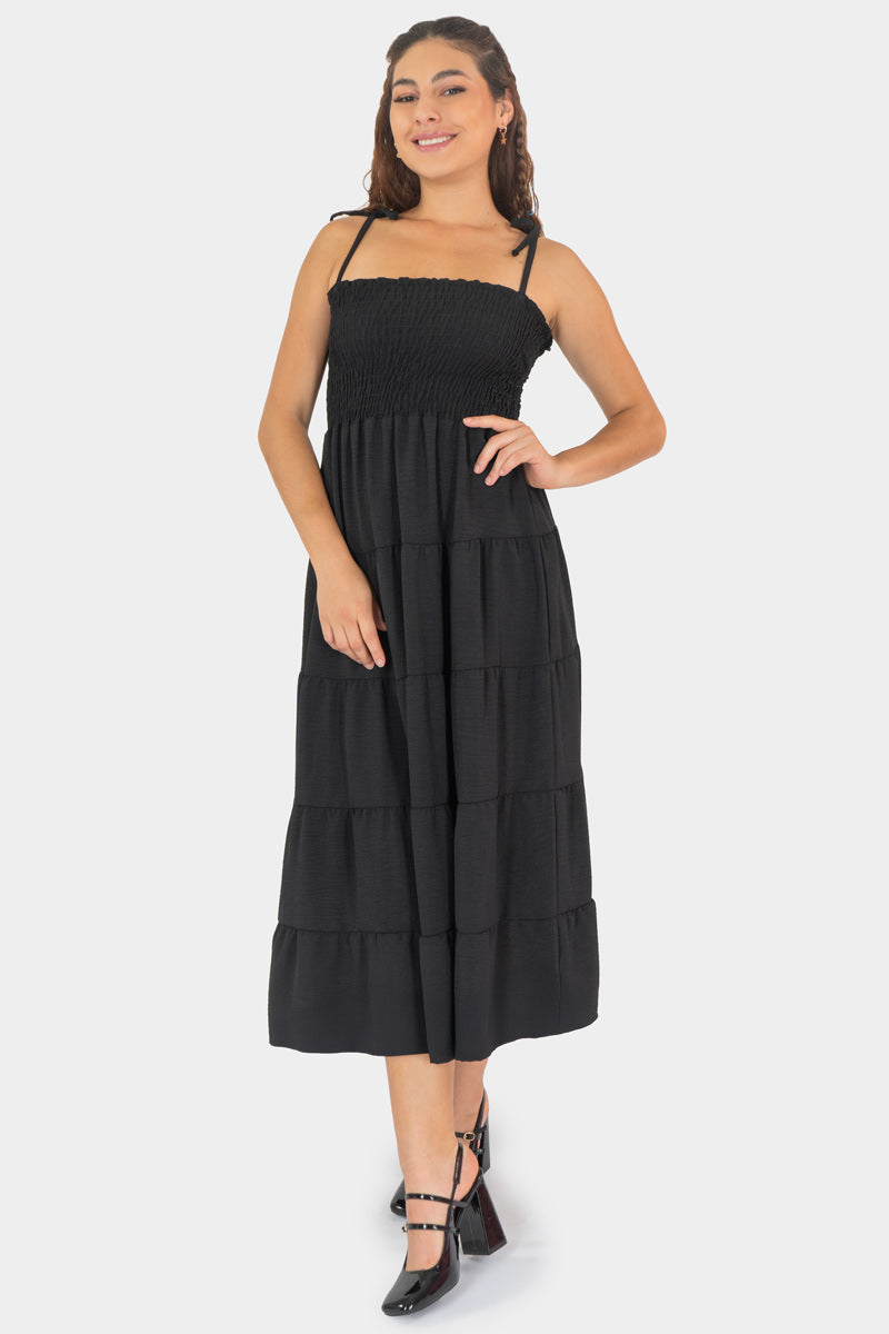Vestido largo tipo midi con tirantes finos y falda devolcada en tres niveles, confeccionado en tejido ligero y cómodo. Su cintura smocked brinda ajuste favorecedor, mientras el diseño en tono negro admite looks simples o combinados con accesorios llamativos. Ideal para un estilo moderno y juvenil, perfecto para daytime o eventos informales.