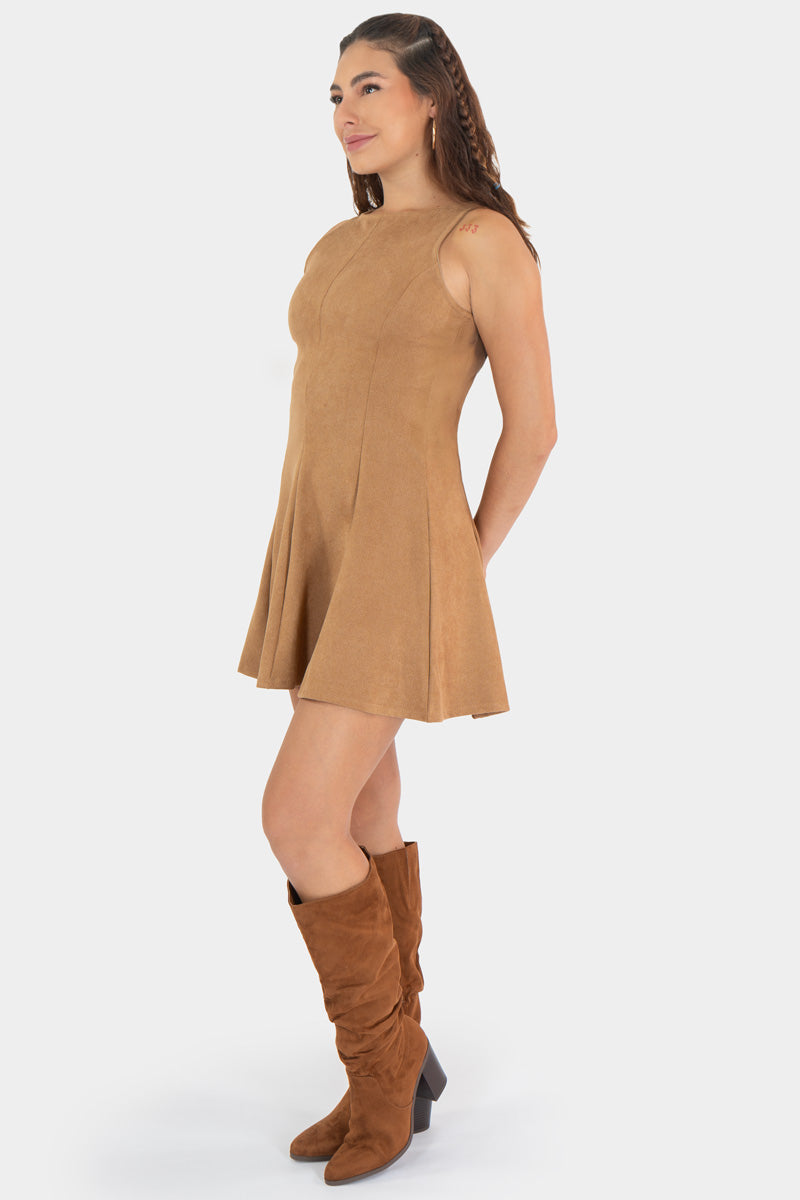 Deslumbra con un encanto moderno y cómodo: este vestido tipo A en camel suave combina una silueta favorecedora con un tejido caído y suave. Sin mangas, cuello alto y costuras estratégicas estilizan la figura, mientras la falda amplia añade movimiento y un toque casual-chic. Ideal para llevar del día a la noche, con botas o tacones según la ocasión.