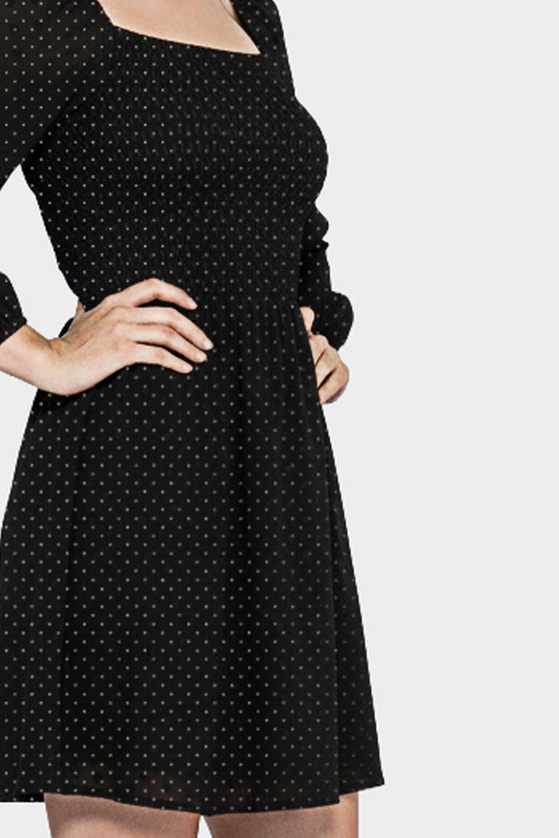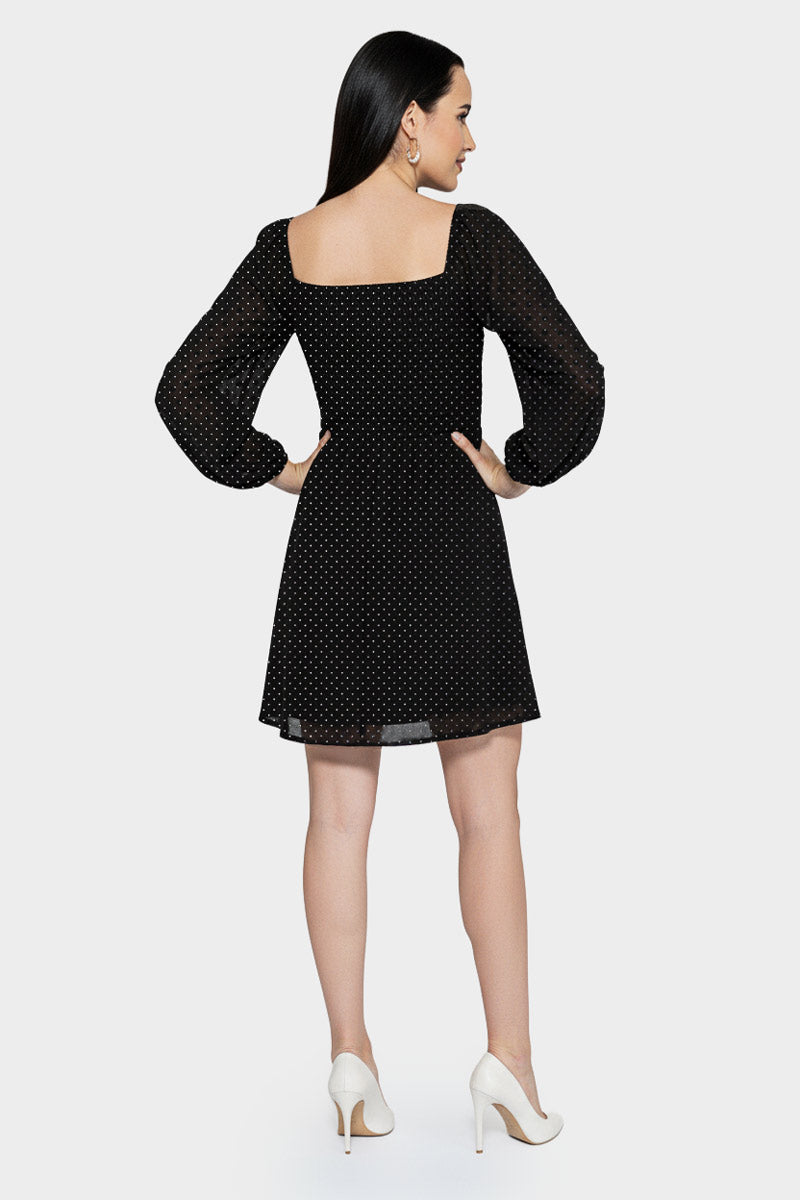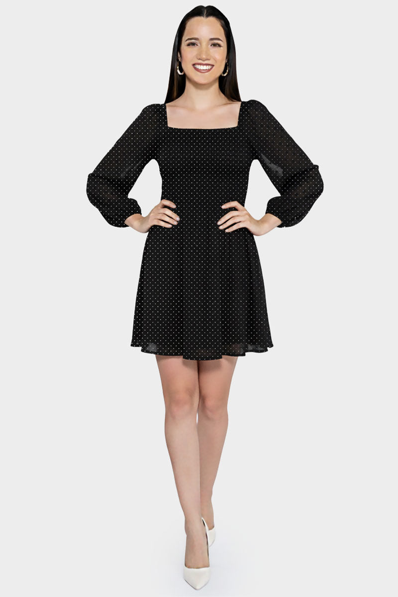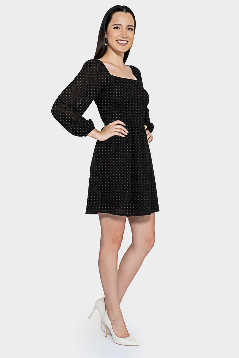 Vestido corto con delicado estampado de lunares y manga larga. Su escote cuadrado y falda con caída suave crean una silueta femenina y elegante, ideal para eventos, fiestas o looks de noche con un toque romántico.