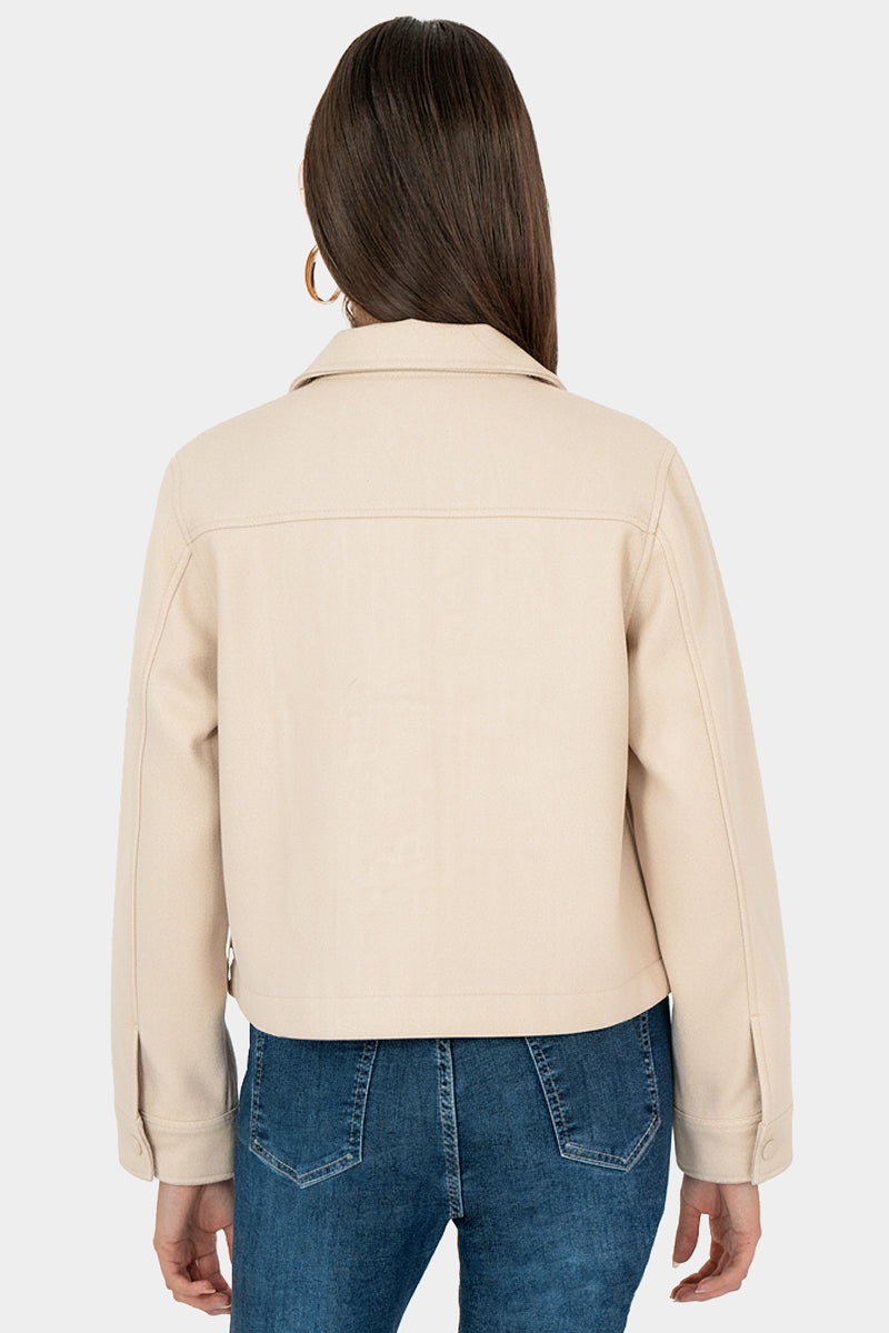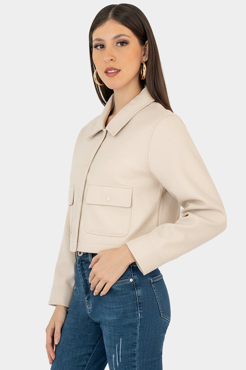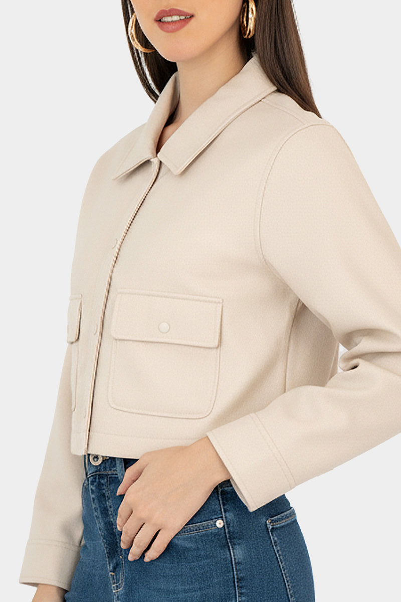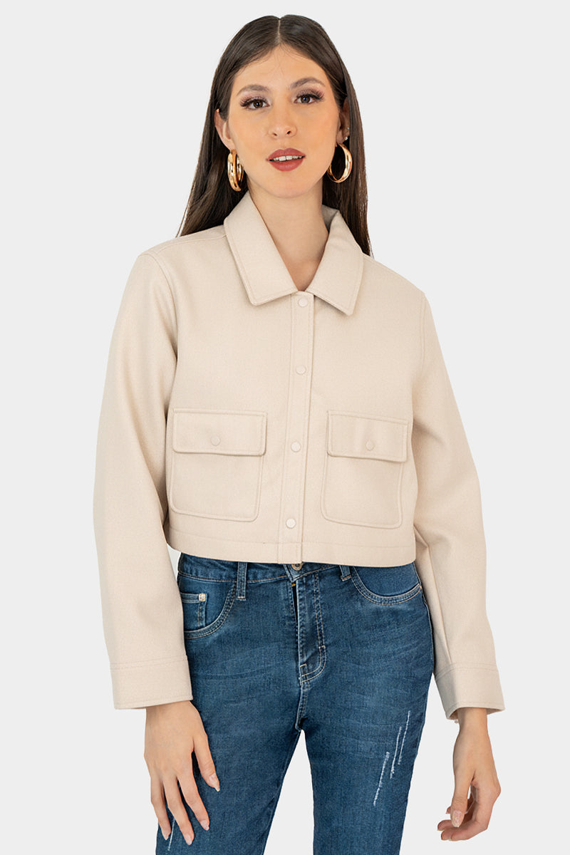 Esta chaqueta corta en tono beige es el toque moderno y minimalista que eleva cualquier look. Con bolsillos frontales de estilo utilitario y un corte recto súper favorecedor, combina perfecto con jeans, faldas o vestidos. Ideal para crear outfits frescos, juveniles y con ese aire chic que nunca pasa de moda.