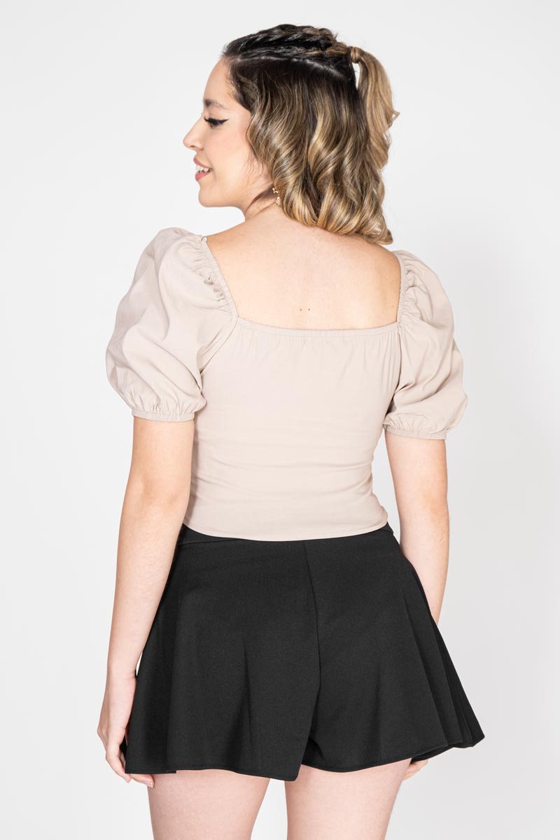 Blusa manga corta abullonada look corset enresortado en espalda.