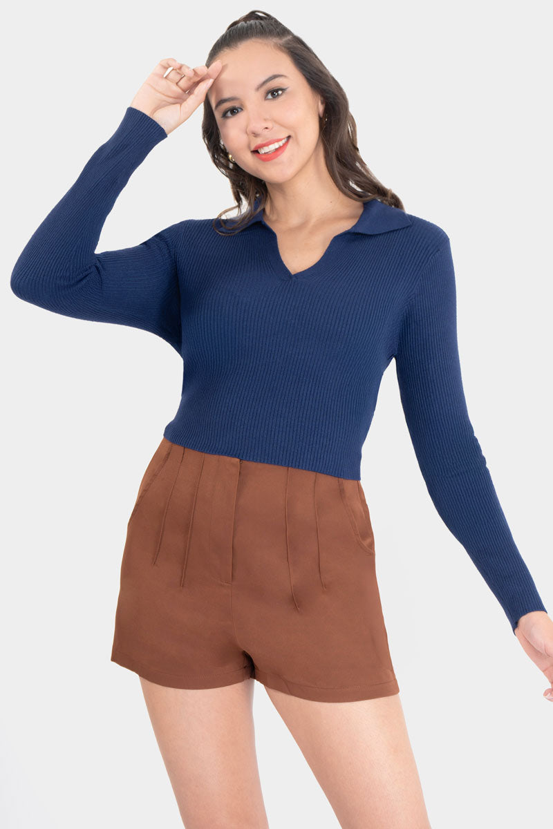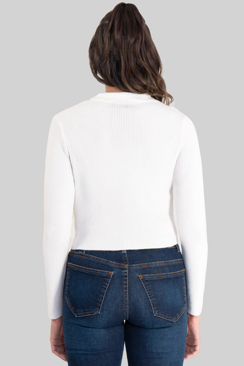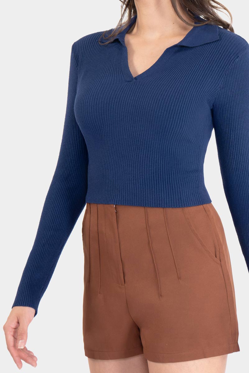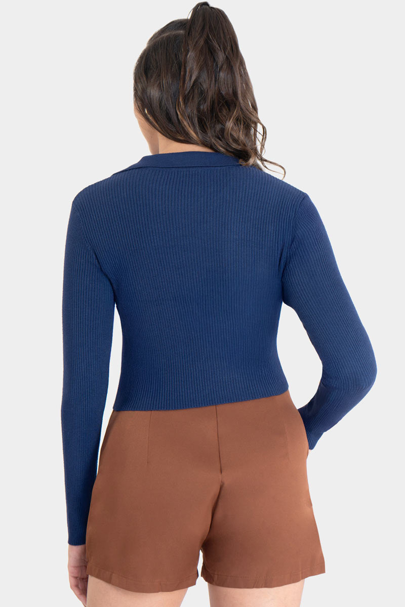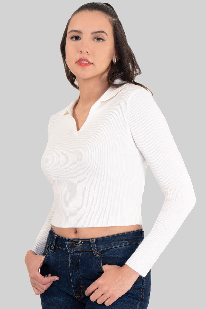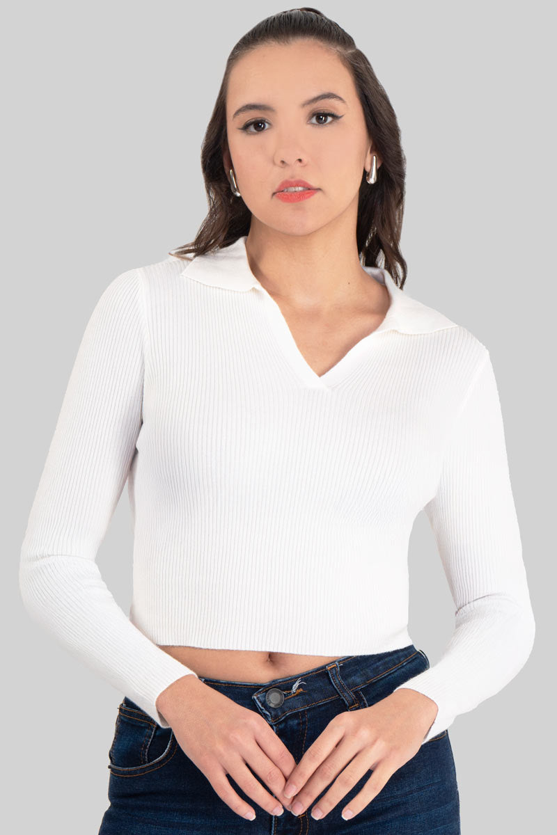 Este suéter crop de manga larga con cuello tipo polo es el equilibrio perfecto entre casual y chic. Su tela acanalada lo hace súper cómodo y el escote en V le da ese toque moderno que resalta cualquier look. Ideal para usar con jeans, faldas o pantalones high waist, tela fresca y elástica, corte crop que estiliza, versátil, casual de día, elegante de noche.