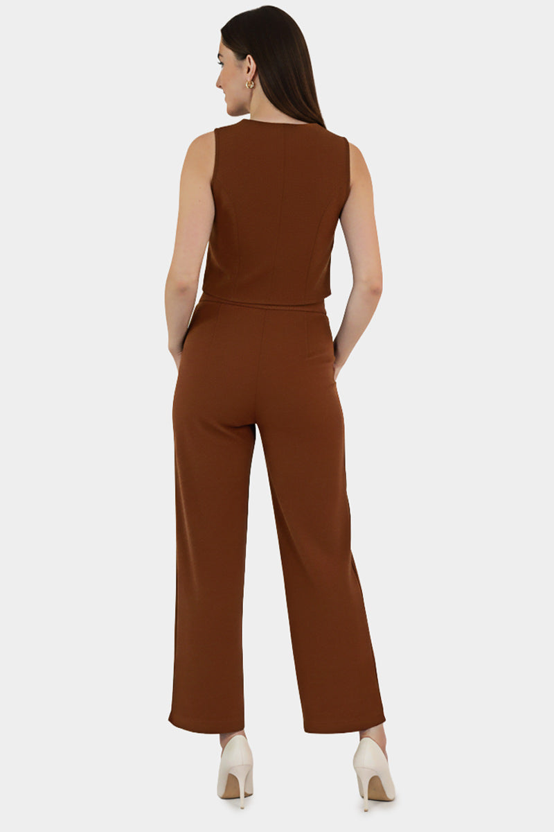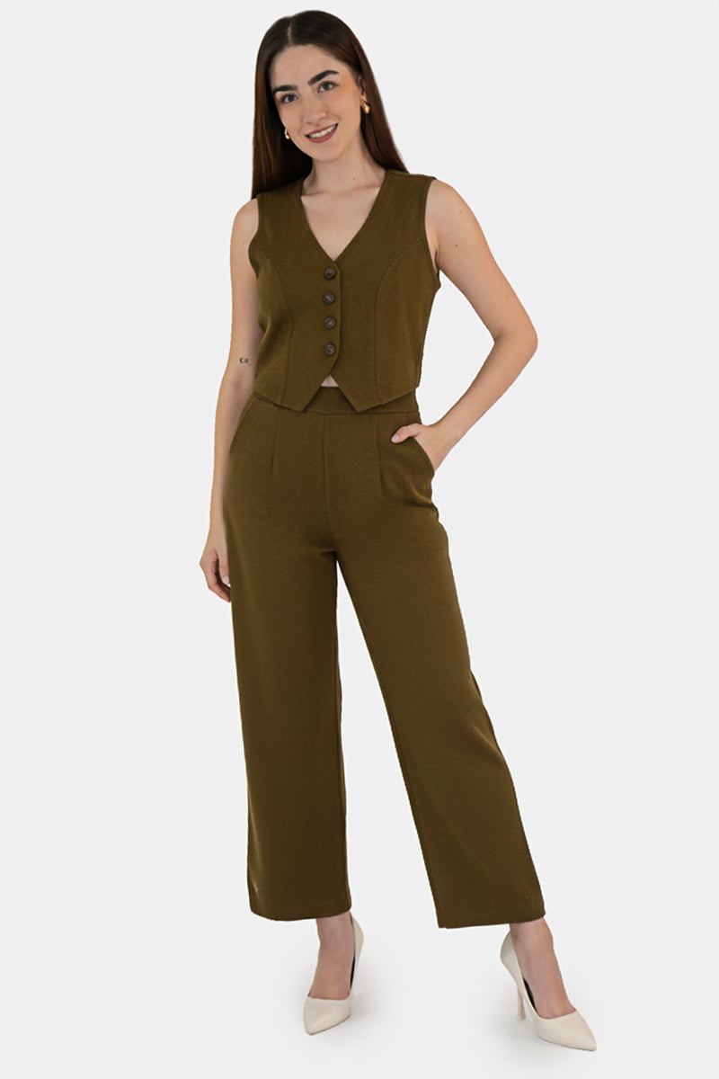 Conjunto compuesto por chaleco y pantalón de corte recto. Su diseño moderno y elegante lo convierte en la opción perfecta para eventos, reuniones o looks formales con un toque actual.