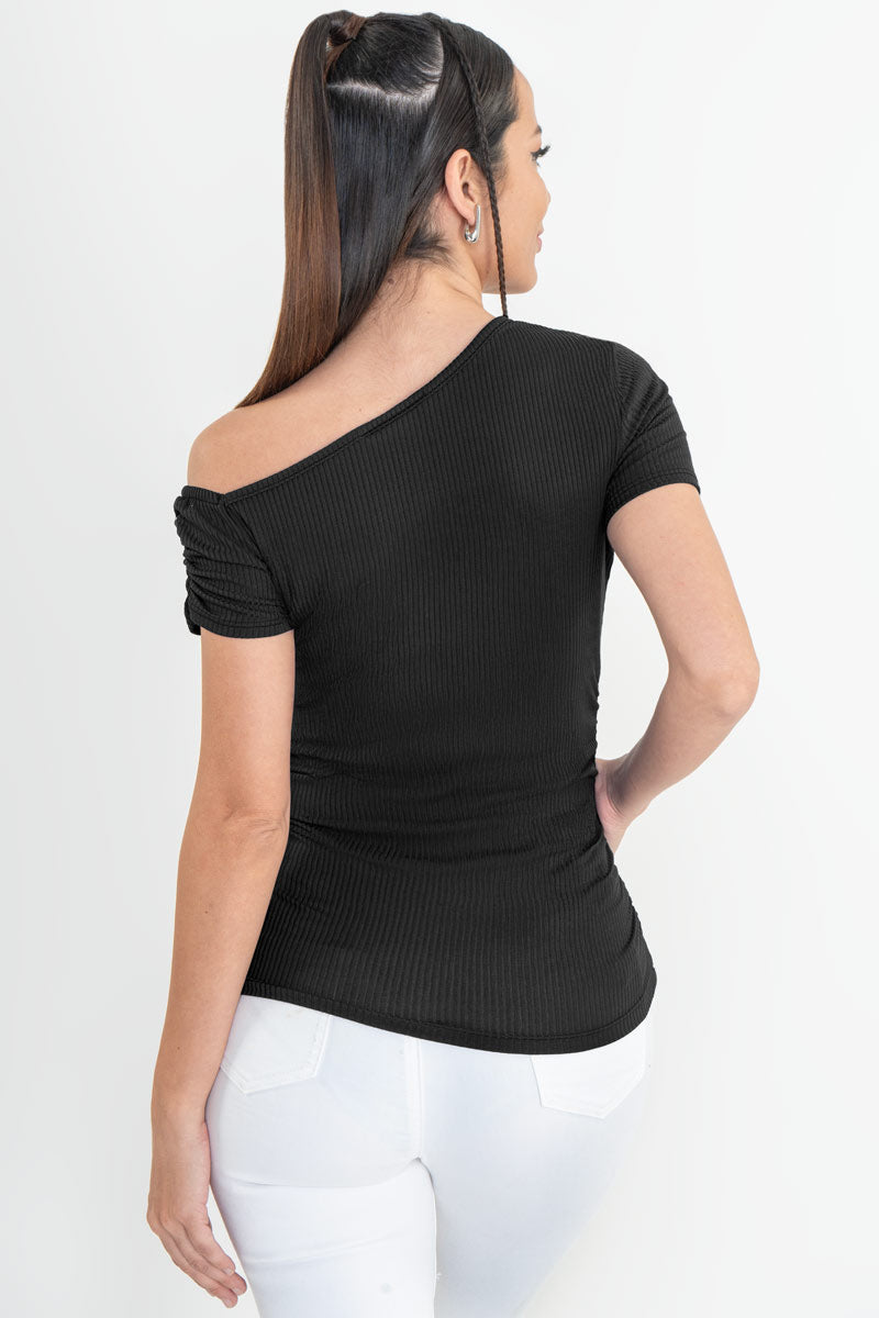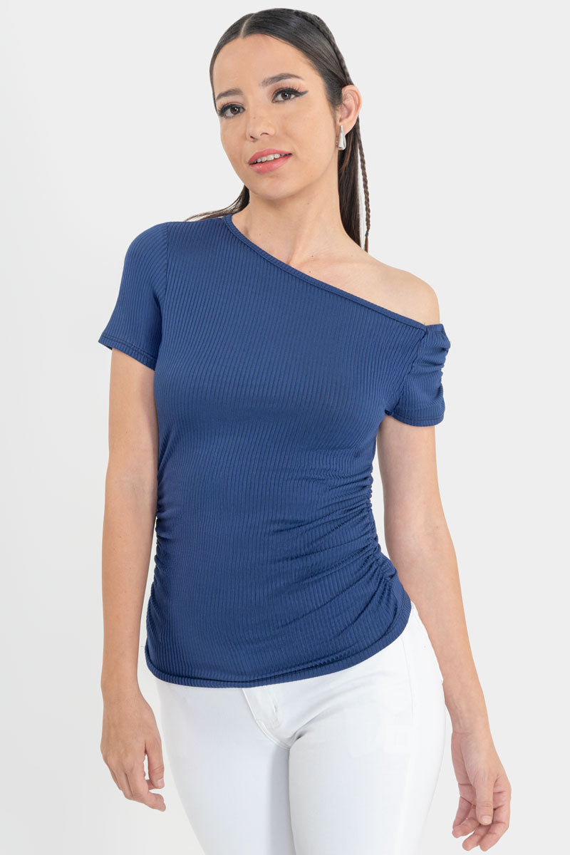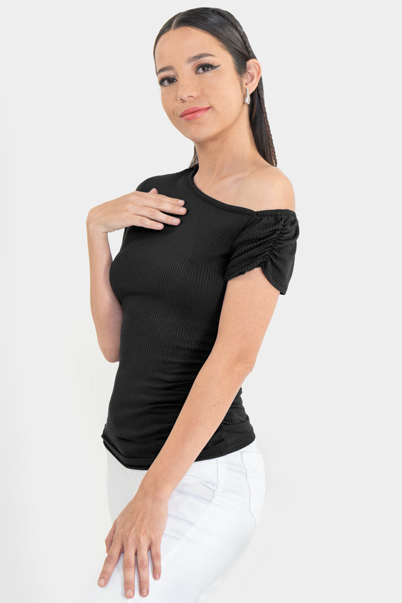 Dale un giro a tu look con esta blusa de escote asimétrico que resalta tu lado más trendy y femenino. Su diseño de un solo hombro con fruncido lateral estiliza tu figura y añade ese toque moderno que tu outfit necesita. El tejido acanalado no solo es cómodo, sino que también aporta textura y estilo sin esfuerzo.