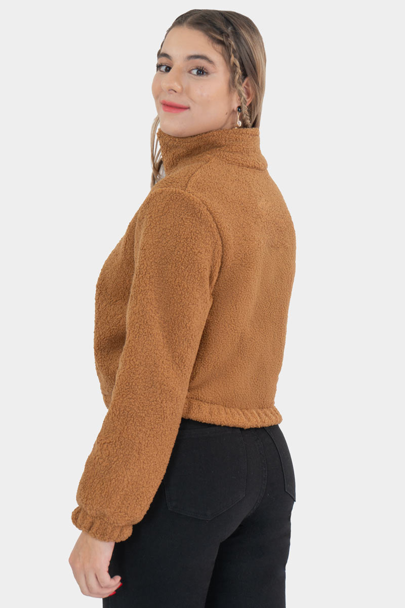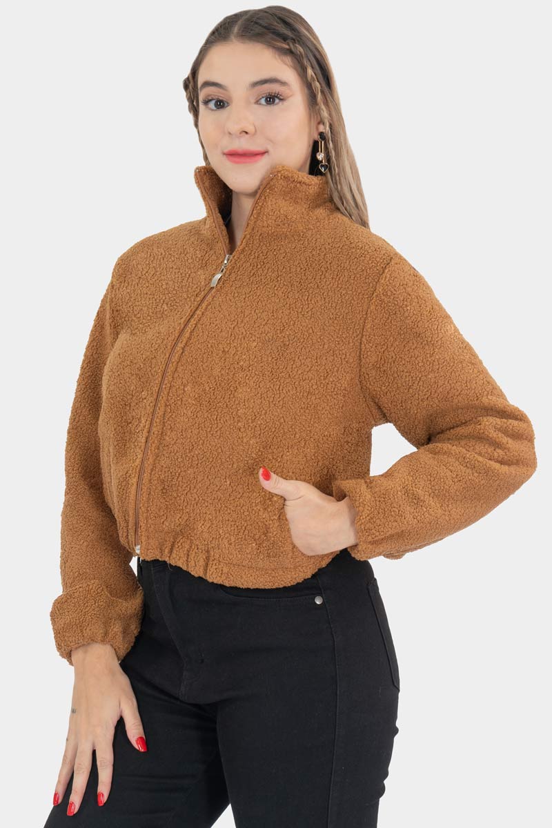 Descubre esta chaqueta teddy color camel, moderna y versátil: cierre frontal, cuello alto suave y volumen cómodo que abraza la silueta. Ideal para combinar con camisetas básicas o tops, crea looks casuales o urbanos con un toque cálido y juvenil para el día a día.