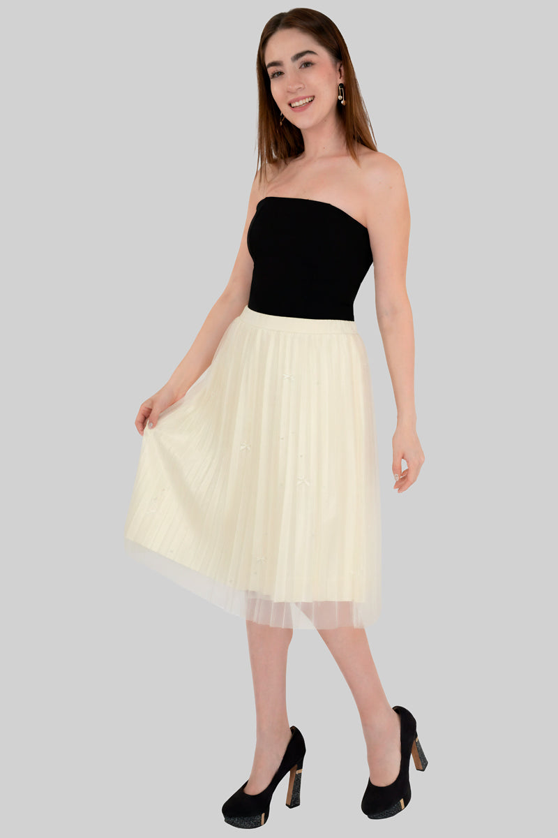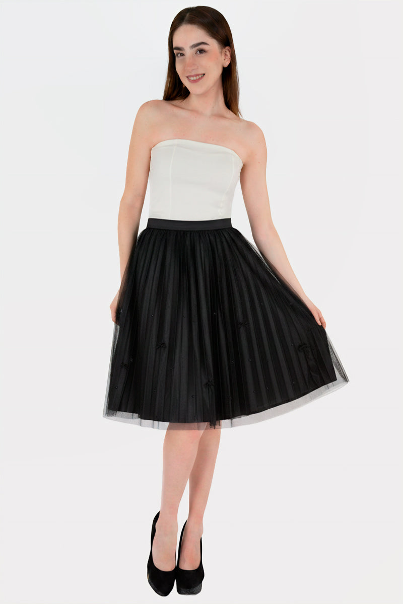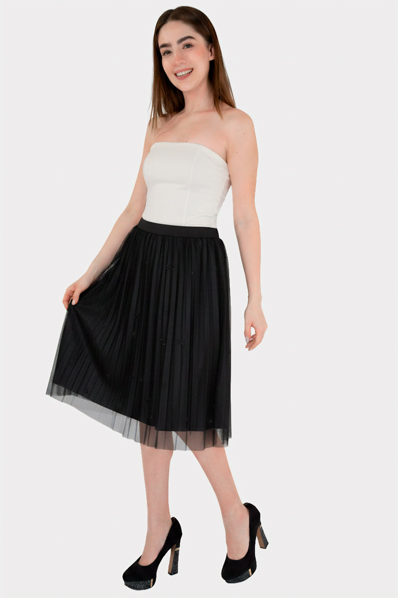 Falda plisada de tul con un toque delicado y femenino que eleva cualquier look. Su diseño ligero y fluido aporta movimiento y estilo, mientras que la cintura cómoda define la silueta sin esfuerzo. Ideal para combinar con blusas básicas o tops más formales, es una prenda versátil que va perfecto del día a día a ocasiones especiales con un aire juvenil y moderno.
