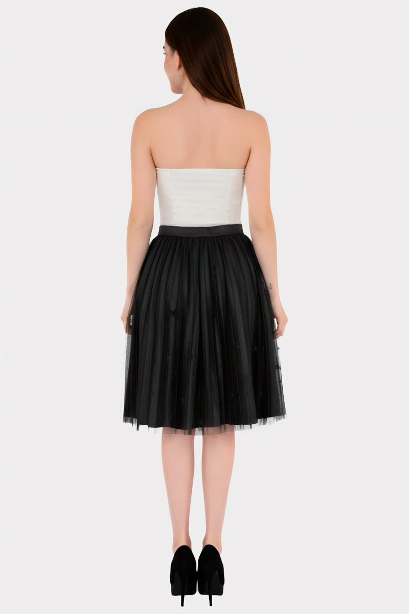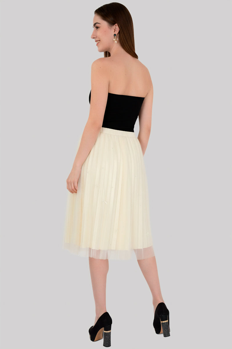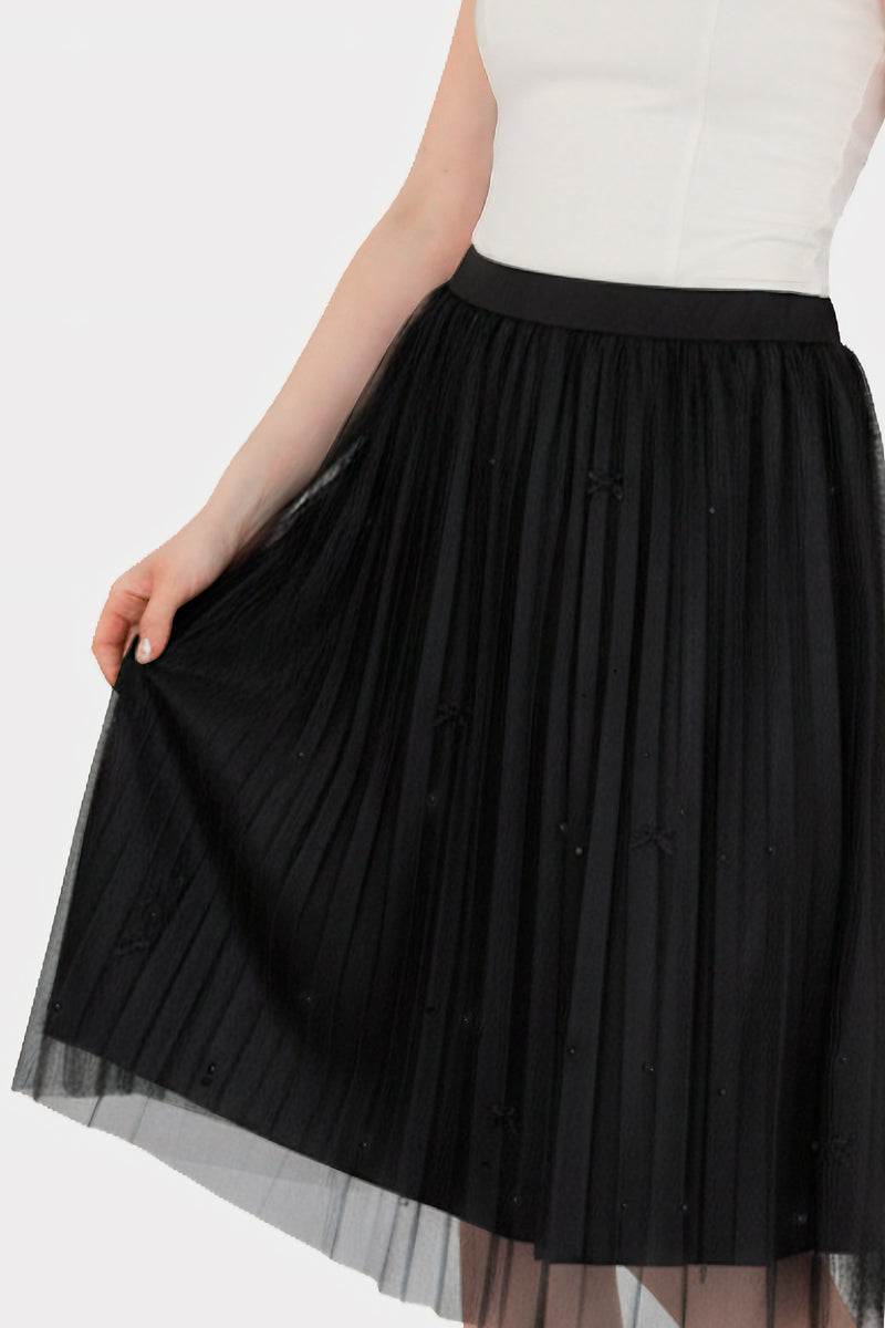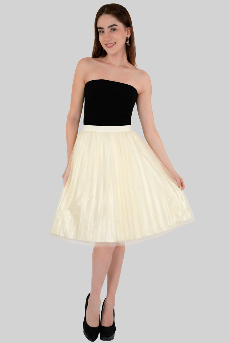 Falda plisada de tul con un toque delicado y femenino que eleva cualquier look. Su diseño ligero y fluido aporta movimiento y estilo, mientras que la cintura cómoda define la silueta sin esfuerzo. Ideal para combinar con blusas básicas o tops más formales, es una prenda versátil que va perfecto del día a día a ocasiones especiales con un aire juvenil y moderno.